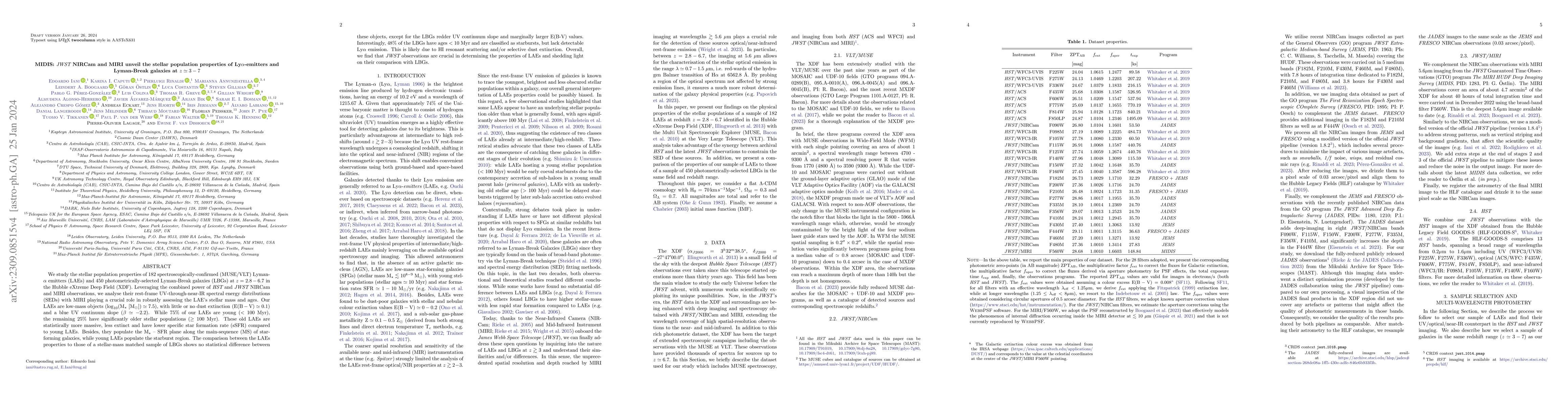 We study the stellar population properties of 182 spectroscopically-confirmed (MUSE/VLT) Lyman-$\alpha$ emitters (LAEs) and 450 photometrically-selected Lyman-Break galaxies (LBGs) at z = 2.8 - 6.7 in the Hubble eXtreme Deep Field (XDF). Leveraging the combined power of HST and JWST NIRCam and MIRI observations, we analyse their rest-frame UV-through-near-IR spectral energy distributions (SEDs) with MIRI playing a crucial role in robustly assessing the LAE's stellar mass and ages. Our LAEs are low-mass objects (log$_{10}$(M$_\star$[M$_\odot$]) ~ 7.5), with little or no dust extinction (E(B - V) ~ 0.1) and a blue UV continuum slope ($\beta$ ~ -2.2). While 75% of our LAEs are young (< 100 Myr), the remaining 25% have significantly older stellar populations (> 100 Myr). These old LAEs are statistically more massive, less extinct and have lower specific star formation rate (sSFR) compared to young LAEs. Besides, they populate the M$_\star$ - SFR plane along the main-sequence (MS) of star-forming galaxies, while young LAEs populate the starburst region. The comparison between the LAEs properties to those of a stellar-mass matched sample of LBGs shows no statistical difference between these objects, except for the LBGs redder UV continuum slope and marginally larger E(B - V) values. Interestingly, 48% of the LBGs have ages < 10 Myr and are classified as starbursts, but lack detectable Ly$\alpha$ emission. This is likely due to HI resonant scattering and/or selective dust extinction. Overall, we find that JWST observations are crucial in determining the properties of LAEs and shedding light on the properties and similarities between LAEs and LBGs.