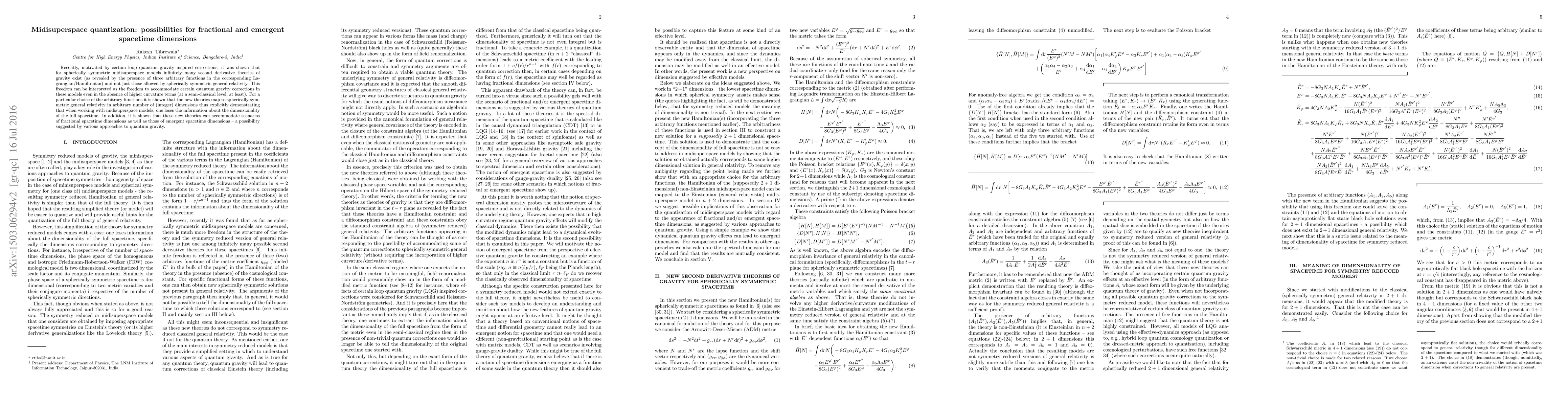 Recently, motivated by certain loop quantum gravity inspired corrections, it was shown that for spherically symmetric midisuperspace models infinitely many second derivative theories of gravity exist (as revealed by the presence of three arbitrary functions in the corresponding Lagrangian/Hamiltonian) and not just those allowed by spherically symmetric general relativity. This freedom can be interpreted as the freedom to accommodate certain quantum gravity corrections in these models even in the absence of higher curvature terms (at a semi-classical level, at least). For a particular choice of the arbitrary functions it is shown that the new theories map to spherically symmetric general relativity in arbitrary number of (integer) dimensions thus explicitly demonstrating that when working with midisuperspace models, one loses the information about the dimensionality of the full spacetime. In addition, it is shown that these new theories can accommodate scenarios of fractional spacetime dimensions as well as those of emergent spacetime dimensions -- a possibility suggested by various approaches to quantum gravity.