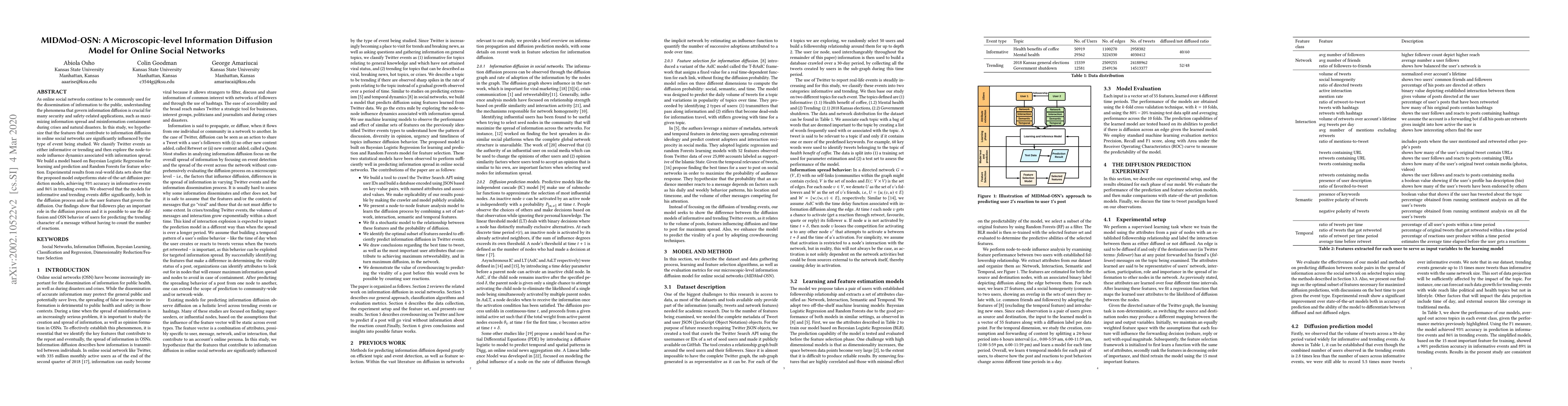 The MIDMod-OSN model uses Bayesian Logistic Regression and Random Forests to predict information diffusion in online social networks, achieving high accuracy. The study finds significant differences in diffusion dynamics for informative versus trending events, highlighting the role of followers in the process.