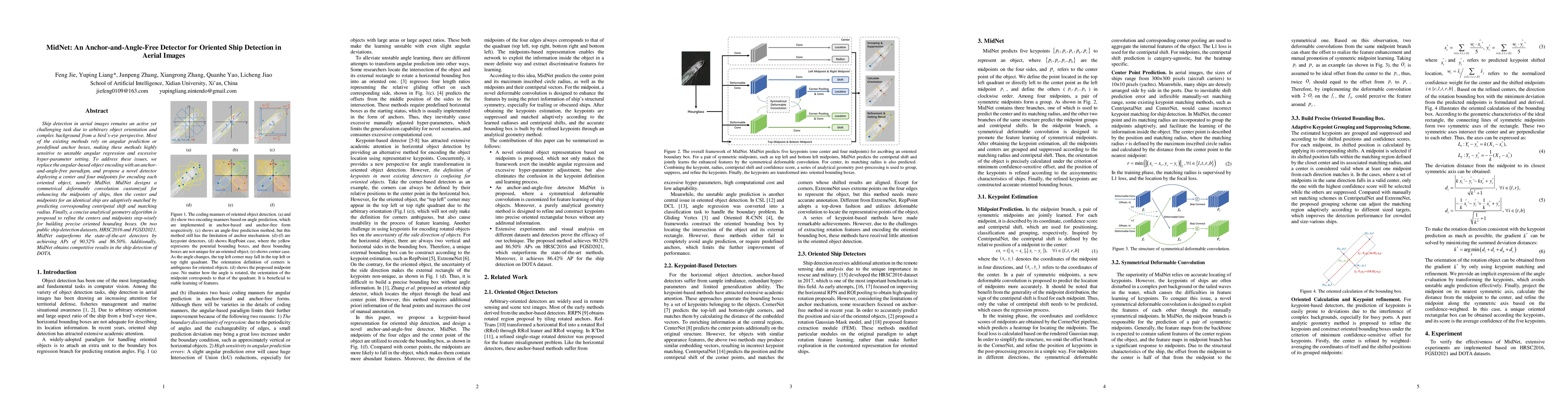 MidNet introduces an anchor-and-angle-free paradigm for oriented ship detection in aerial images, using a center and four midpoints for object encoding. It outperforms existing methods by achieving higher accuracy on public datasets without relying on angular prediction or predefined anchor boxes.