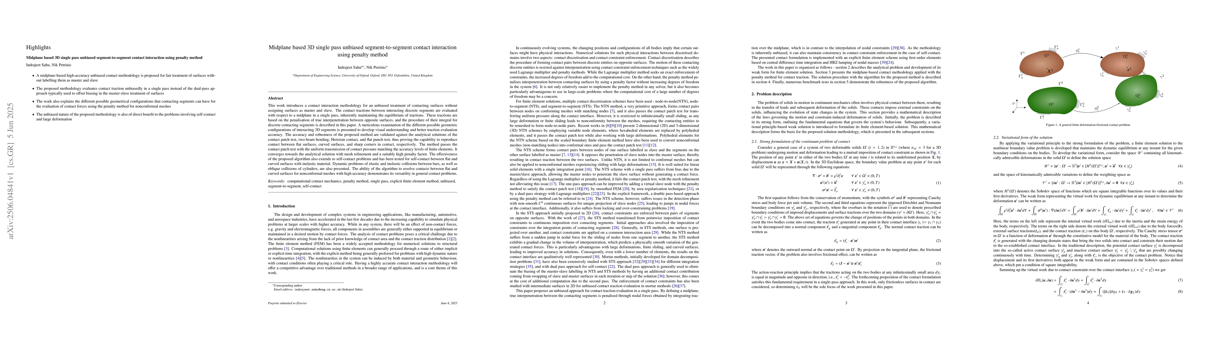 The paper introduces a contact interaction methodology for unbiased treatment of contacting surfaces using a midplane in a single pass, evaluating tractions based on penalization of true interpenetration.