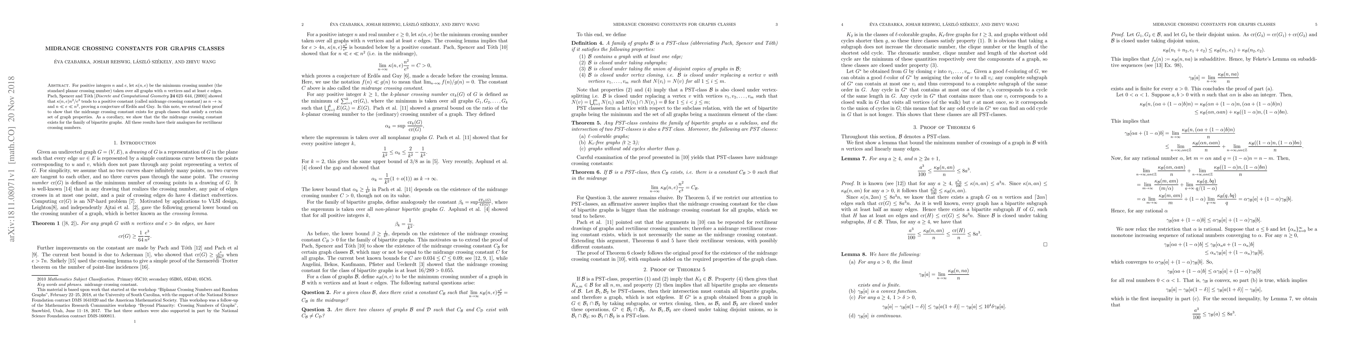 For positive integers $n$ and $e$, let $\kappa(n,e)$ be the minimum crossing number (the standard planar crossing number) taken over all graphs with $n$ vertices and at least $e$ edges. Pach, Spencer and T\'oth [Discrete and Computational Geometry 24 623--644, (2000)] showed that $\kappa(n,e) n^2/e^3$ tends to a positive constant (called midrange crossing constant) as $n\to \infty$ and $n \ll e \ll n^2$, proving a conjecture of Erd\H{o}s and Guy. In this note, we extend their proof to show that the midrange crossing constant exists for graph classes that satisfy a certain set of graph properties. As a corollary, we show that the the midrange crossing constant exists for the family of bipartite graphs. All these results have their analogues for rectilinear crossing numbers.