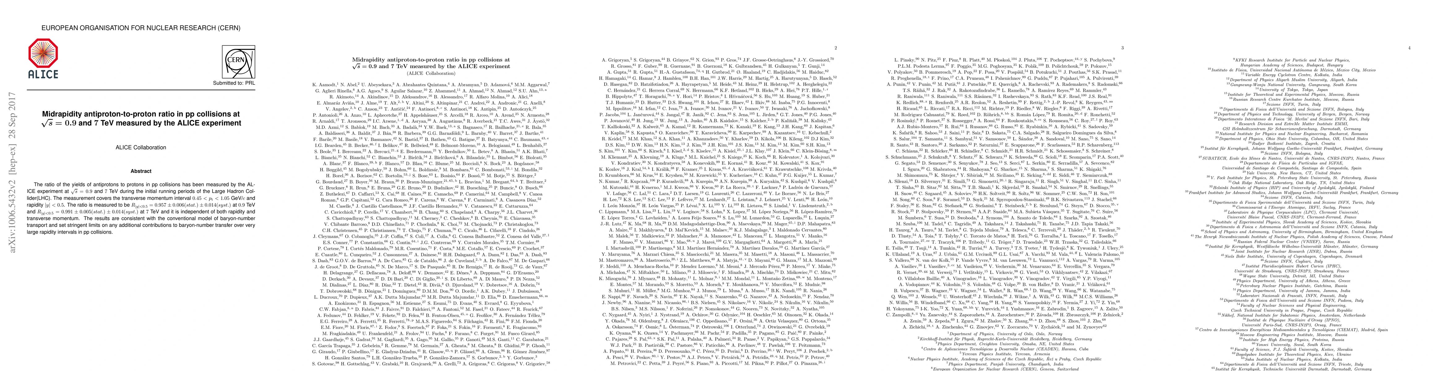 The ALICE experiment measured the antiproton-to-proton ratio in pp collisions at 0.9 TeV and 7 TeV, finding ratios of 0.957 and 0.991 respectively, with no dependence on rapidity or transverse momentum.