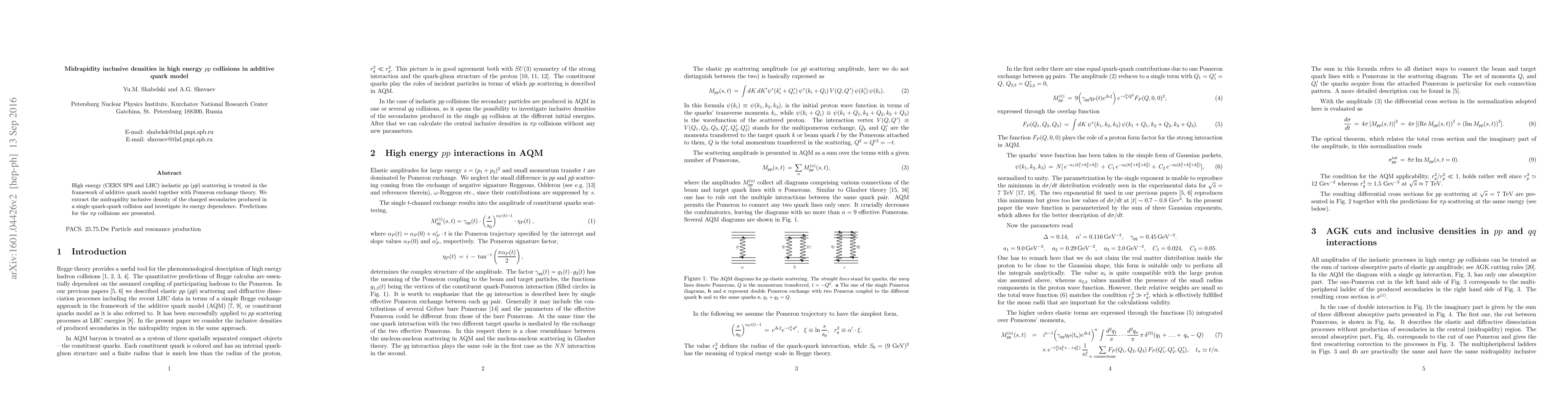 This paper uses the additive quark model and Pomeron exchange theory to analyze high-energy $pp$ scattering, focusing on the midrapidity inclusive density of charged secondaries from single quark-quark collisions and its energy dependence. Predictions for $\pi p$ collisions are also provided.