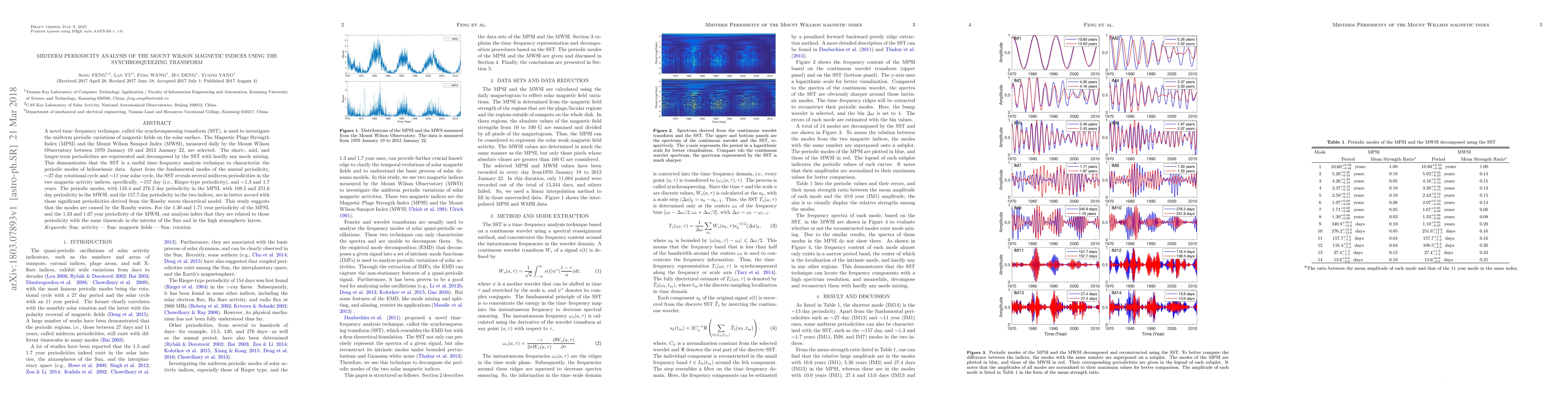 This research applies the Synchrosqueezing Transform (SST) to analyze midterm periodic variations in solar magnetic fields using Mount Wilson Observatory data (1970-2012). SST effectively decomposes short, mid, and long-term periodicities, revealing additional midterm periods like 157 days (Rieger-type) and 1.3, 1.7 years. It also identifies periodicities in Magnetic Plage Strength Index (MPSI) and Mount Wilson Sunspot Index (MWSI) aligned with Rossby waves theory, suggesting these modes are caused by such waves. Further, it connects certain periodicity in MPSI and MWSI to interior solar and high atmospheric layers.