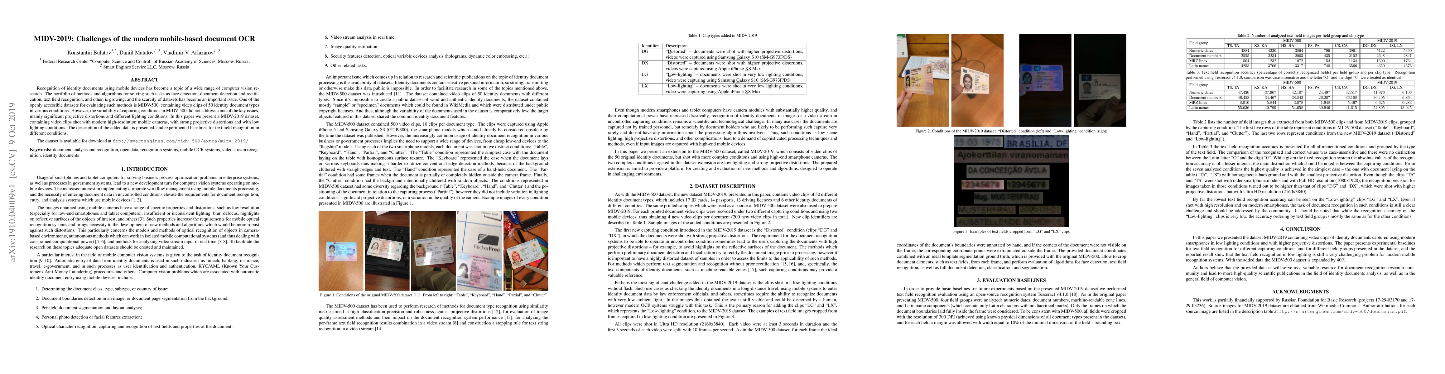 Researchers created a new dataset, MIDV-2019, to improve mobile-based document OCR by including projective distortions and low lighting conditions. The dataset aims to better prepare methods for real-world challenges in identity document recognition.