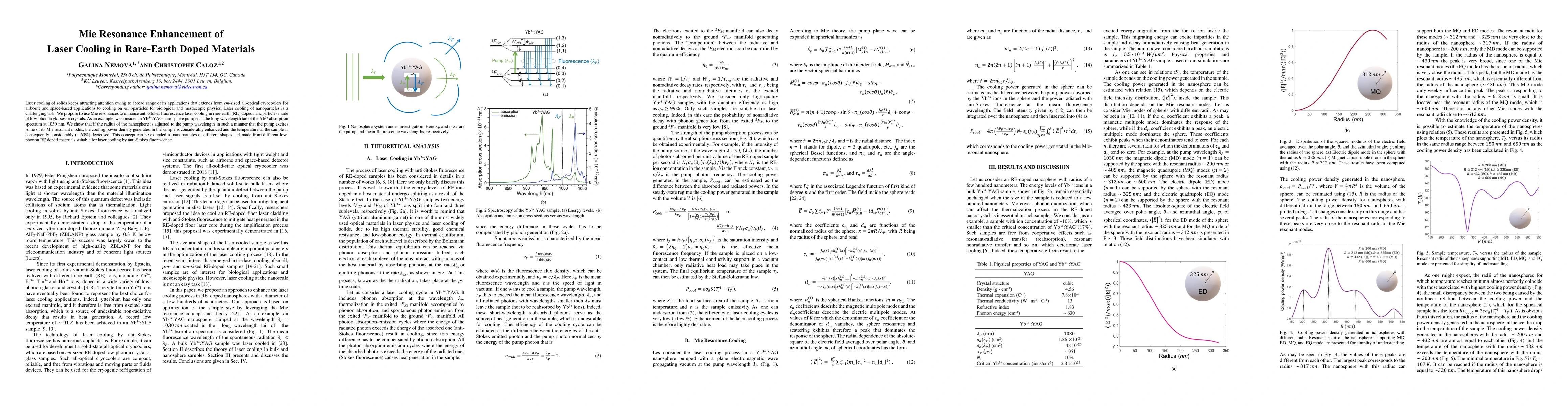 This paper proposes using Mie resonances to significantly enhance laser cooling in rare-earth doped nanoparticles, demonstrating a 63% temperature reduction in Yb3+:YAG nanospheres by optimizing their size to excite Mie resonant modes at 1030 nm. The method can be generalized to other shapes and materials for improved anti-Stokes fluorescence cooling.
