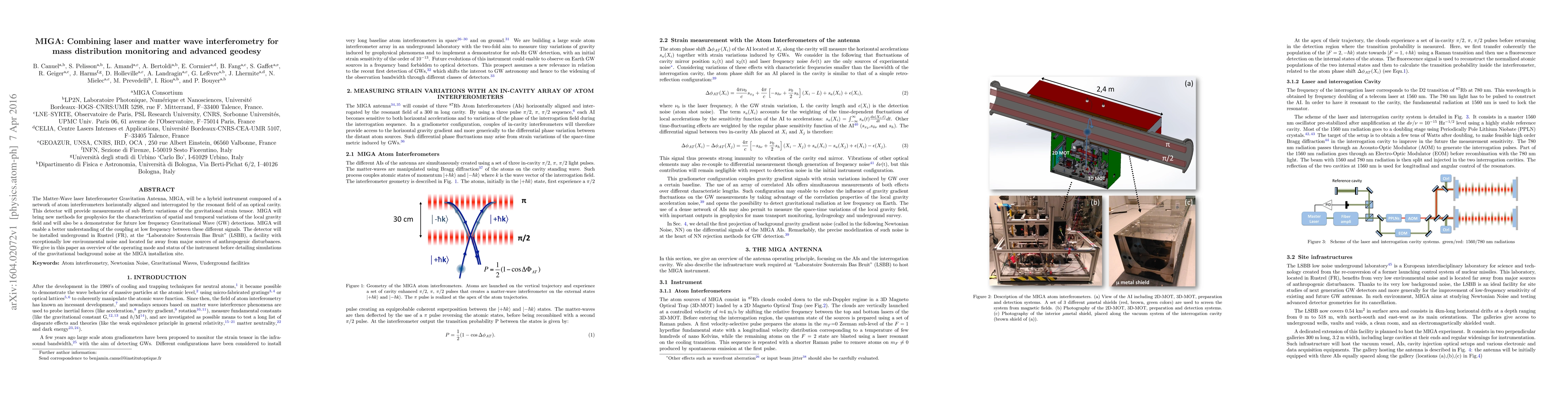 MIGA combines laser and matter wave interferometry for advanced geodesy and low-frequency gravitational wave detection. The hybrid instrument, installed underground in Rustrel, France, aims to measure sub-Hertz gravitational strain variations and will provide new geophysical insights into local gravity field variations.