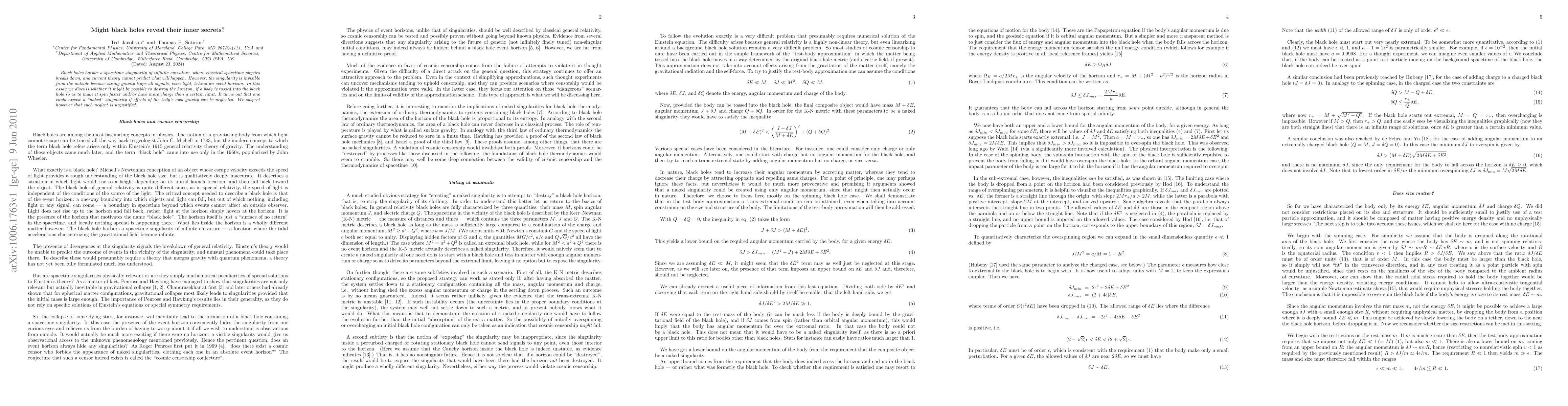 Black holes harbor a spacetime singularity of infinite curvature, where classical spacetime physics breaks down, and current theory cannot predict what will happen. However, the singularity is invisible from the outside because strong gravity traps all signals, even light, behind an event horizon. In this essay we discuss whether it might be possible to destroy the horizon, if a body is tossed into the black hole so as to make it spin faster and/or have more charge than a certain limit. It turns out that one could expose a "naked" singularity if effects of the body's own gravity can be neglected. We suspect however that such neglect is unjustified.