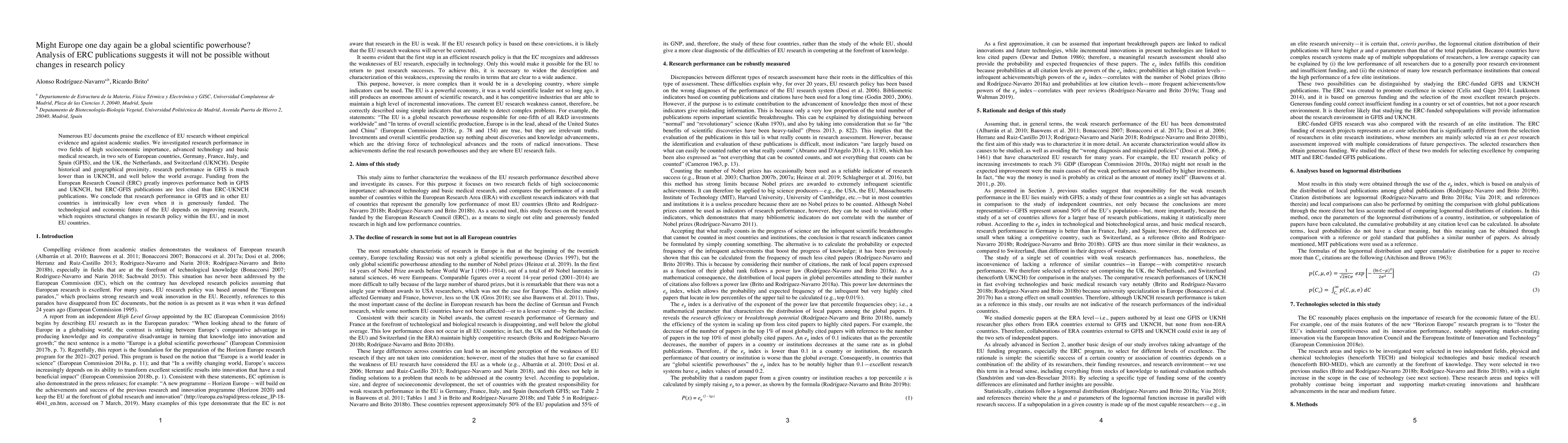 Numerous EU documents praise the excellence of EU research without empirical evidence and against academic studies. We investigated research performance in two fields of high socioeconomic importance, advanced technology and basic medical research, in two sets of European countries, Germany, France, Italy, and Spain (GFIS), and the UK, the Netherlands, and Switzerland (UKNCH). Despite historical and geographical proximity, research performance in GFIS is much lower than in UKNCH, and well below the world average. Funding from the European Research Council (ERC) greatly improves performance both in GFIS and UKNCH, but ERC-GFIS publications are less cited than ERC-UKNCH publications. We conclude that research performance in GFIS and in other EU countries is intrinsically low even when it is generously funded. The technological and economic future of the EU depends on improving research, which requires structural changes in research policy within the EU, and in most EU countries.