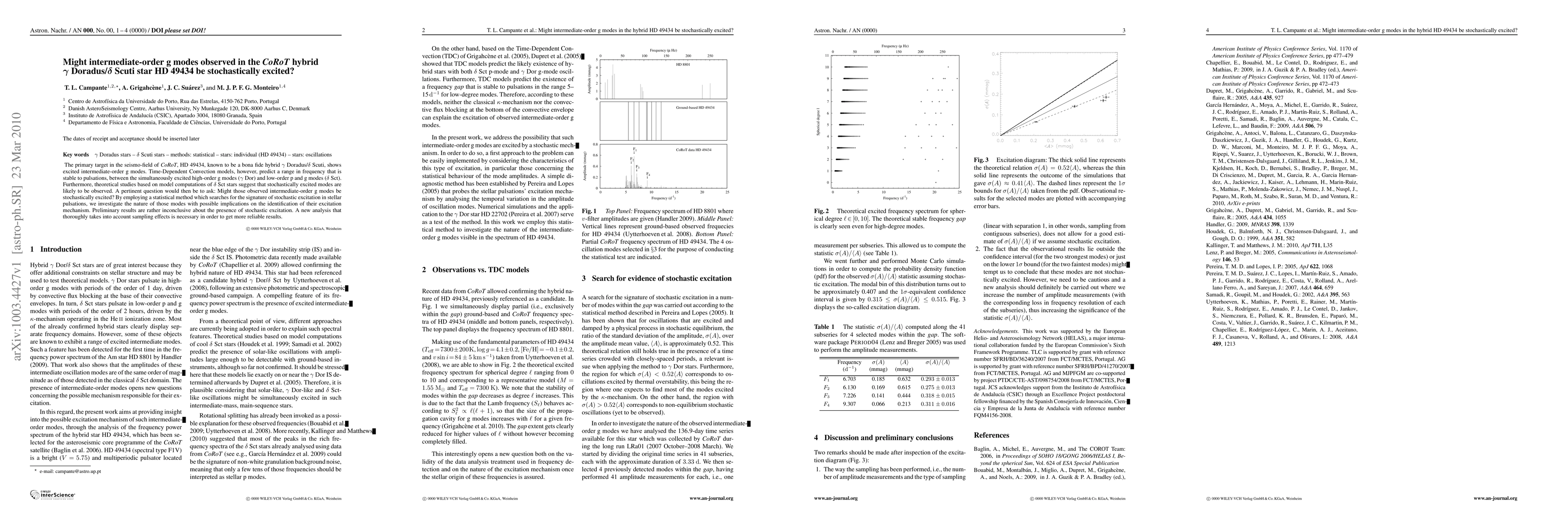 The primary target in the seismo-field of CoRoT, HD 49434, known to be a bona fide hybrid gamma Doradus/delta Scuti, shows excited intermediate-order g modes. Time-Dependent Convection models, however, predict a range in frequency that is stable to pulsations, between the simultaneously excited high-order g modes (gamma Dor) and low-order p and g modes (delta Sct). Furthermore, theoretical studies based on model computations of delta Sct stars suggest that stochastically excited modes are likely to be observed. A pertinent question would then be to ask: Might those observed intermediate-order g modes be stochastically excited? By employing a statistical method which searches for the signature of stochastic excitation in stellar pulsations, we investigate the nature of those modes with possible implications on the identification of their excitation mechanism. Preliminary results are rather inconclusive about the presence of stochastic excitation. A new analysis that thoroughly takes into account sampling effects is necessary in order to get more reliable results.