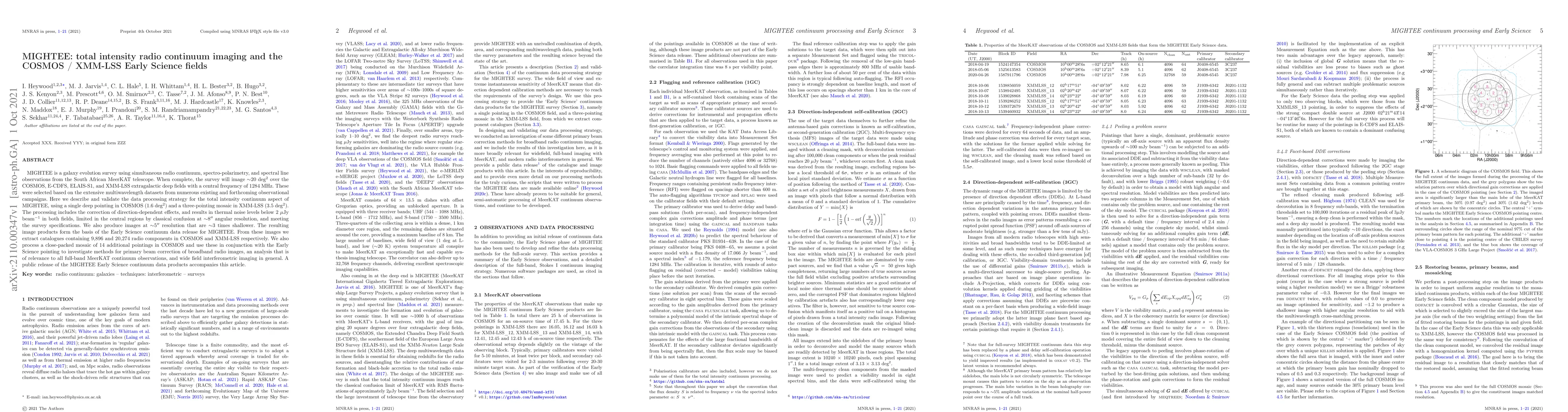 The MIGHTEE survey uses MeerKAT to image 20 deg^2 of cosmic space with high-resolution radio continuum imaging, producing catalogs of over 30,000 radio components, with implications for galaxy evolution research.