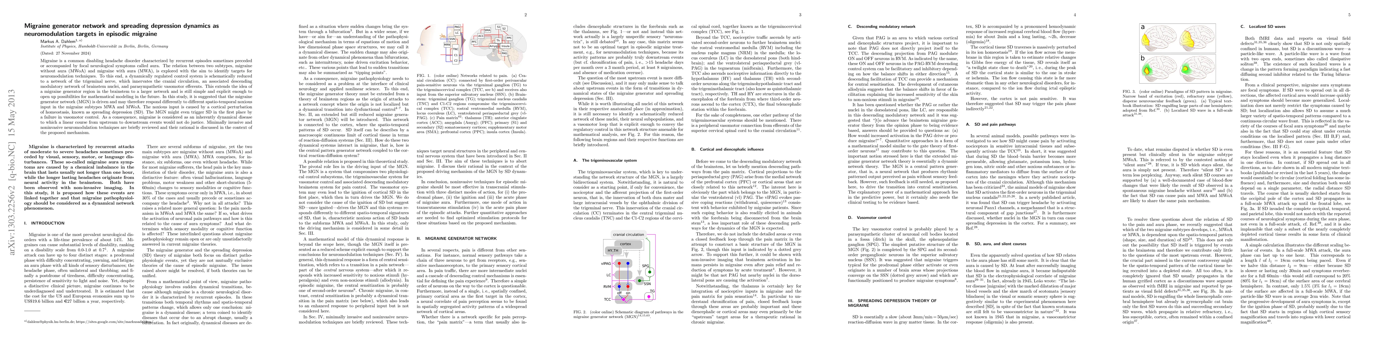 This paper explores the migraine generator network (MGN) as a complex system involving the trigeminal nerve, brainstem nuclei, and parasympathetic pathways, proposing that different migraine subtypes (MWA and MWoA) respond variably to cortical spreading depression (SD). It suggests that MGN may initiate SD due to vasomotor control failure, emphasizing migraine as a dynamic disorder and reviewing potential neuromodulation techniques.
