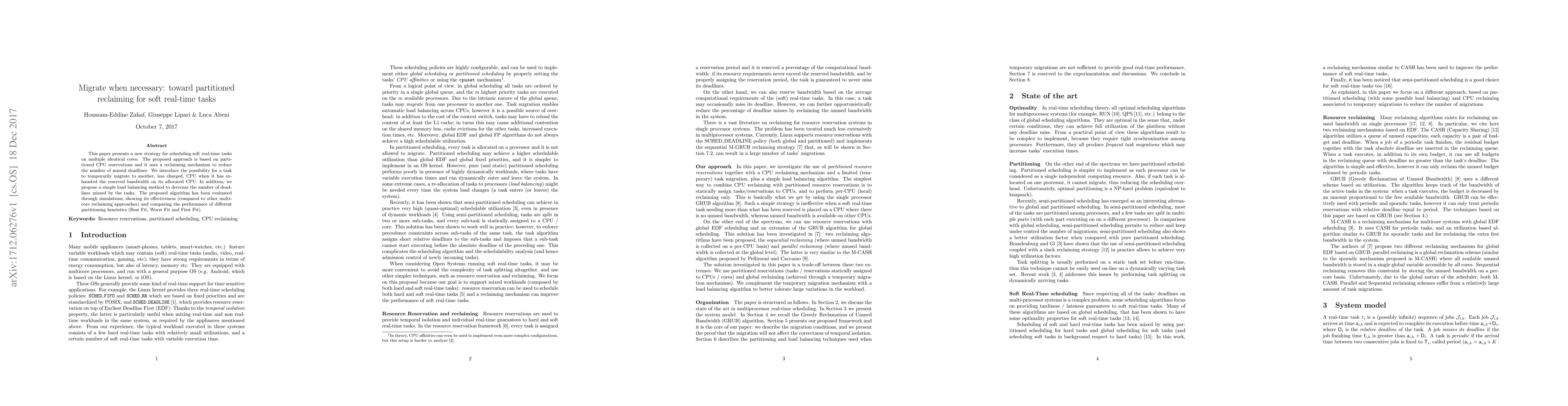 A new strategy for scheduling soft real-time tasks on multiple identical cores is proposed, using partitioned CPU reservations and a reclaiming mechanism to reduce missed deadlines. The approach shows effectiveness through simulations and improves performance with load balancing techniques.