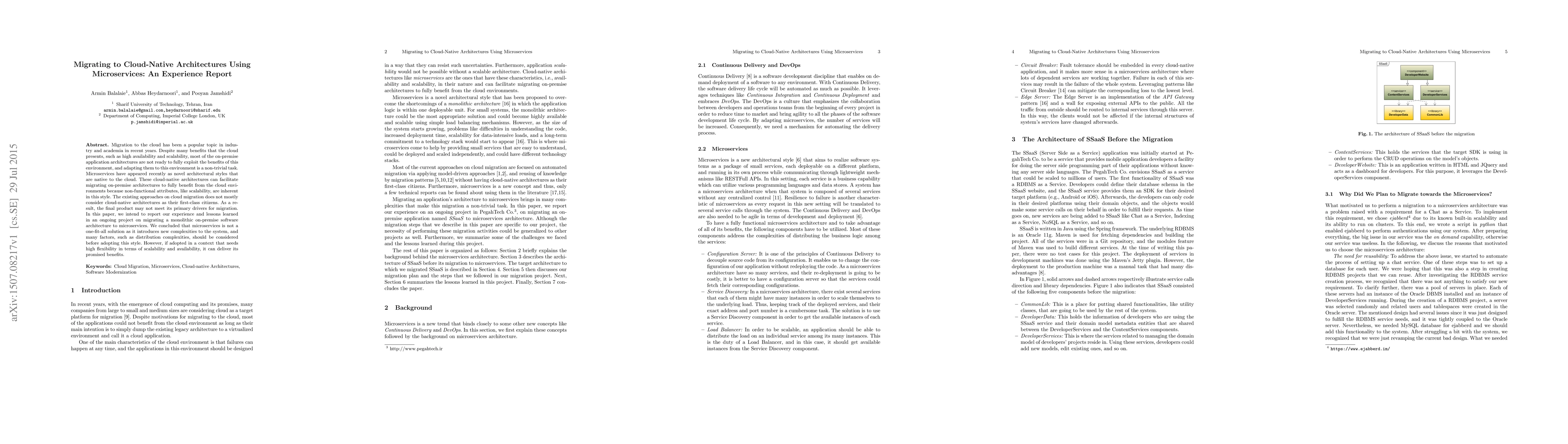 Migration to the cloud has been a popular topic in industry and academia in recent years. Despite many benefits that the cloud presents, such as high availability and scalability, most of the on-premise application architectures are not ready to fully exploit the benefits of this environment, and adapting them to this environment is a non-trivial task. Microservices have appeared recently as novel architectural styles that are native to the cloud. These cloud-native architectures can facilitate migrating on-premise architectures to fully benefit from the cloud environments because non-functional attributes, like scalability, are inherent in this style. The existing approaches on cloud migration does not mostly consider cloud-native architectures as their first-class citizens. As a result, the final product may not meet its primary drivers for migration. In this paper, we intend to report our experience and lessons learned in an ongoing project on migrating a monolithic on-premise software architecture to microservices. We concluded that microservices is not a one-fit-all solution as it introduces new complexities to the system, and many factors, such as distribution complexities, should be considered before adopting this style. However, if adopted in a context that needs high flexibility in terms of scalability and availability, it can deliver its promised benefits.