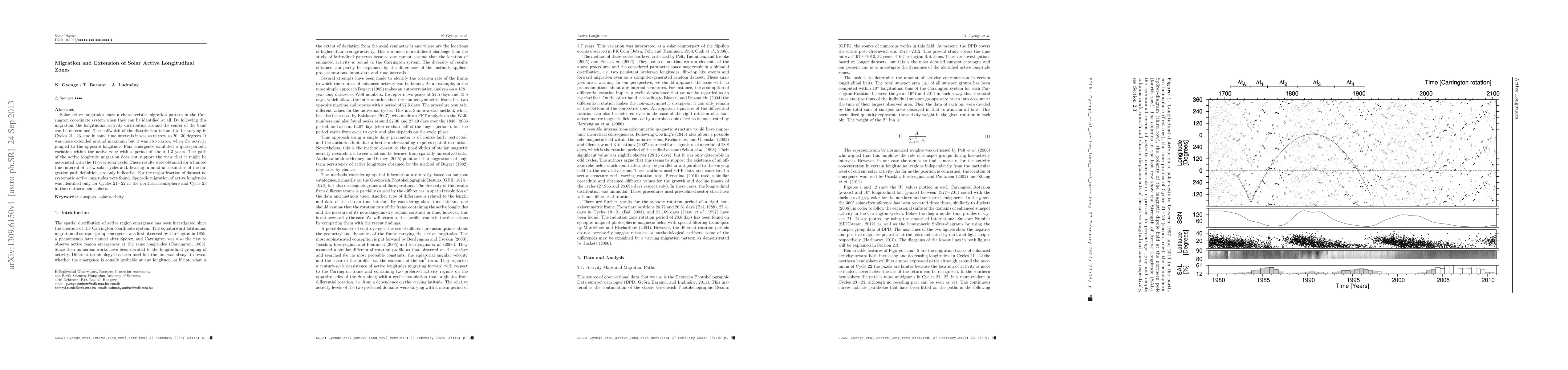 Solar active longitudes show a characteristic migration pattern in the Carrington coordinate system when they can be identified at all. By following this migration, the longitudinal activity distribution around the center of the band can be determined. The halfwidth of the distribution is found to be varying in Cycles 21 - 23, and in some time intervals it was as narrow as 20 - 30 degrees. It was more extended around maximum but it was also narrow when the activity jumped to the opposite longitude. Flux emergence exhibited a quasi-periodic variation within the active zone with a period of about 1.3 years. The path of the active longitude migration does not support the view that it might be associated with the 11-year solar cycle. These results were obtained for a limited time interval of a few solar cycles and, bearing in mind uncertainties of the migration path definition, are only indicative. For the major fraction of dataset no systematic active longitudes were found. Sporadic migration of active longitudes was identified only for Cycles 21 - 22 in the northern hemisphere and Cycle 23 in the southern hemisphere.