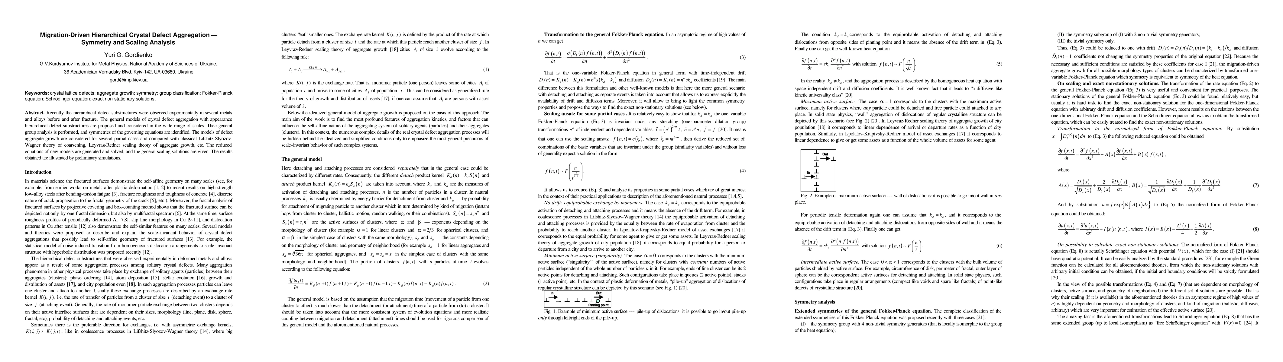 Recently the hierarchical defect substructures were observed experimentally in several metals and alloys before and after fracture. The general models of crystal defect aggregation with appearance hierarchical defect substructures are proposed and considered in the wide range of scales. Their general group analysis is performed, and symmetries of the governing equations are identified. The models of defect aggregate growth are considered for several partial cases and compared with classical Lifshitz-Slyozov-Wagner theory of coarsening, Leyvraz-Redner scaling theory of aggregate growth, etc. The reduced equations of new models are generated and solved, and the general scaling solutions are given. The results obtained are illustrated by preliminary simulations.