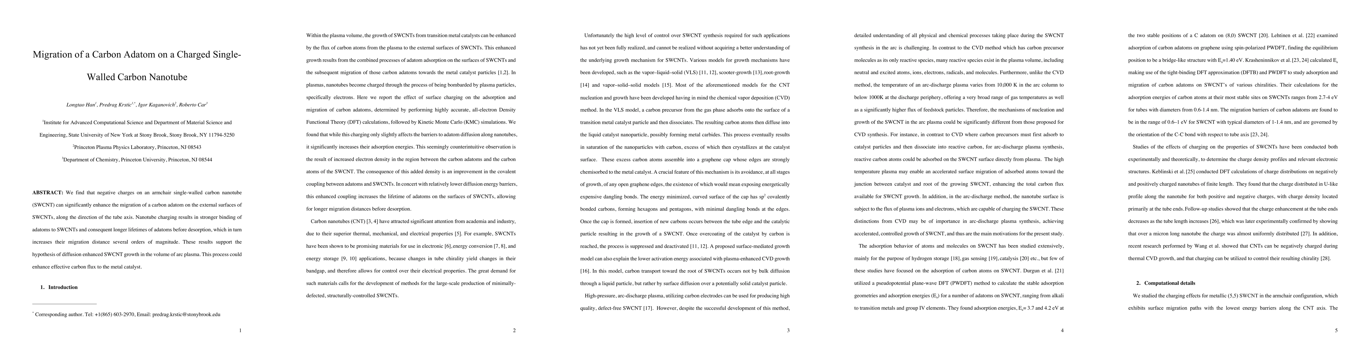 Negative charges on an armchair single-walled carbon nanotube significantly enhance the migration of carbon adatoms along the tube axis, resulting in stronger binding and longer adatom lifetimes, which could boost carbon flux to metal catalysts and support diffusion-enhanced SWCNT growth.
