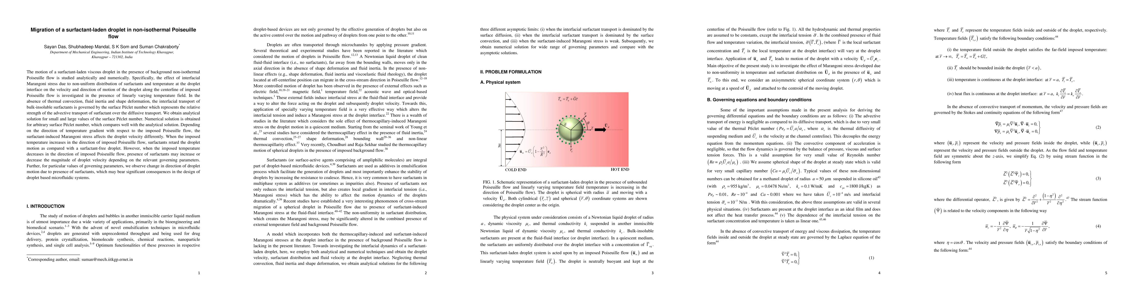 This paper investigates the motion of a surfactant-laden droplet in non-isothermal Poiseuille flow, focusing on the effects of Marangoni stress due to surfactant and temperature gradients. Analytical and numerical solutions show that surfactants can either retard or enhance droplet velocity depending on the temperature gradient direction, potentially altering droplet motion direction and impacting microfluidic system design.