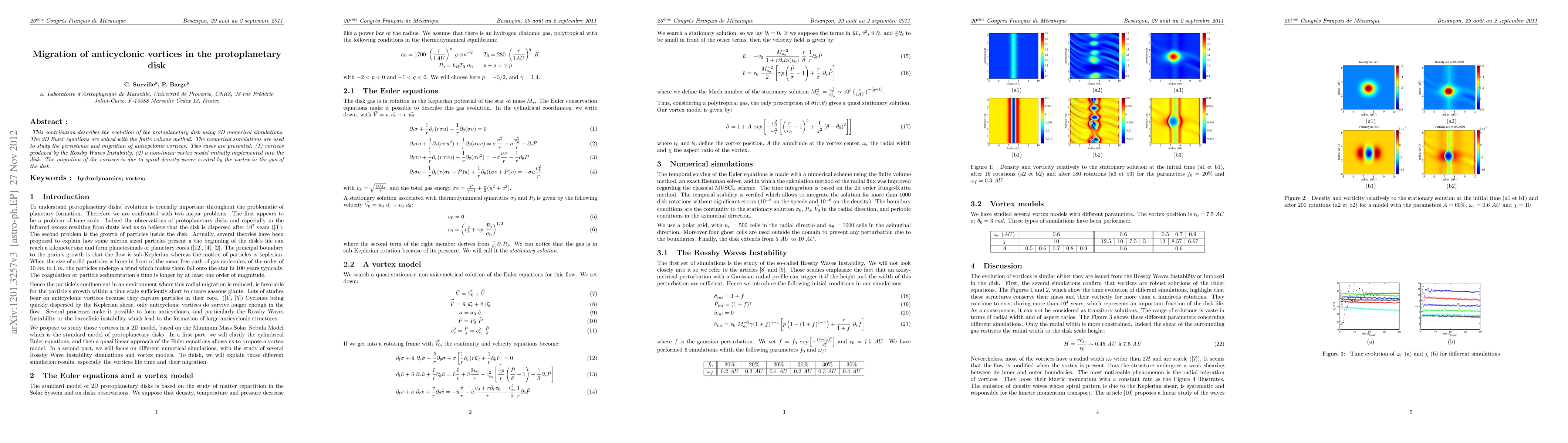 This contribution describes the evolution of the protoplanetary disk using 2D numerical simulations. The 2D Euler equations are solved with the finite volume method. The numerical simulations are used to study the persistence and migration of anticyclonic vortices. Two cases are presented : (1) vortices produced by the Rossby Waves Instability, (2) a non-linear vortex model initially implemented into the disk. The migration of the vortices is due to spiral density waves excited by the vortex in the gas of the disk.
