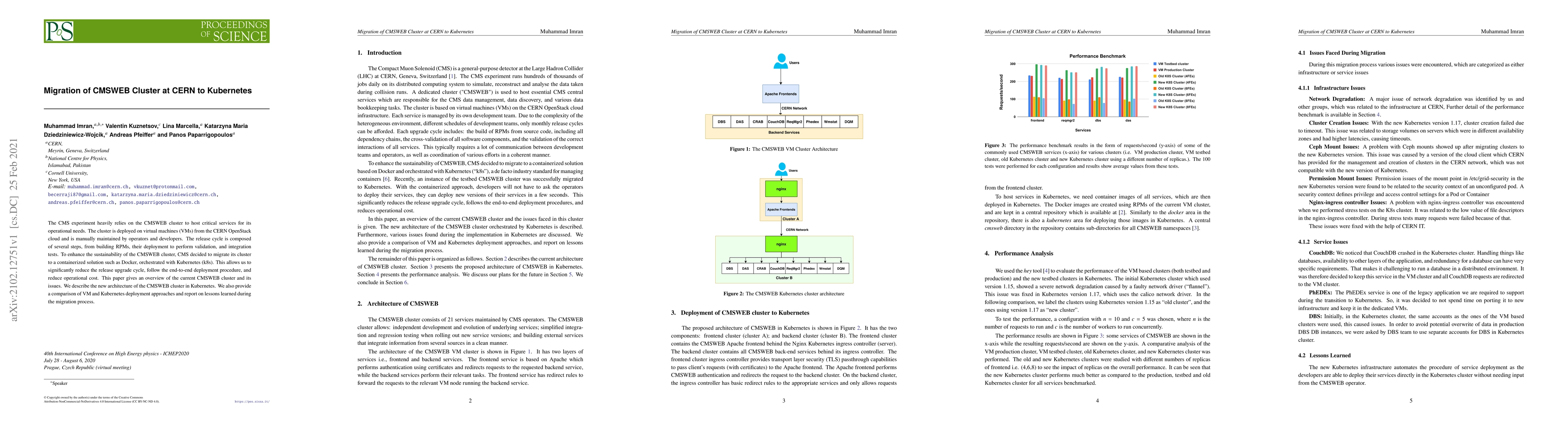 The CMS experiment at CERN migrated its CMSWEB cluster from VMs to Kubernetes, aiming to reduce operational costs and upgrade cycles. The new architecture leverages Docker and Kubernetes for orchestration, offering significant improvements over the previous manual VM-based deployment.