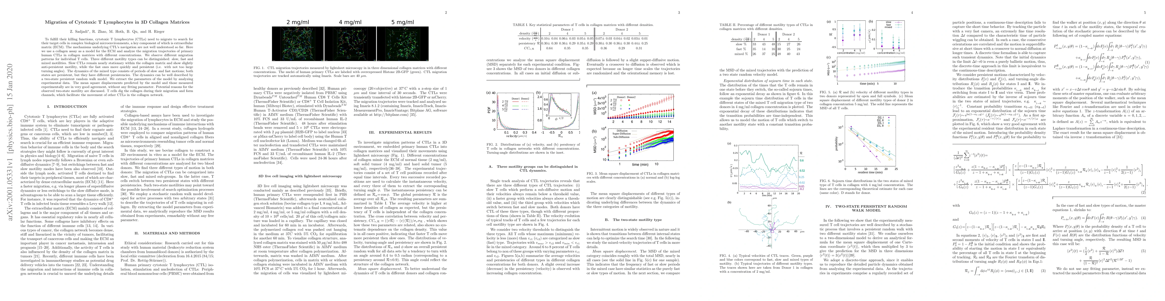 Cytotoxic T lymphocytes migrate differently in 3D collagen matrices, exhibiting slow, fast, or mixed motilities, which can be described by a two-state persistent random walk model. The movement is facilitated by the CTLs digging into the collagen and forming channels to navigate the matrix.
