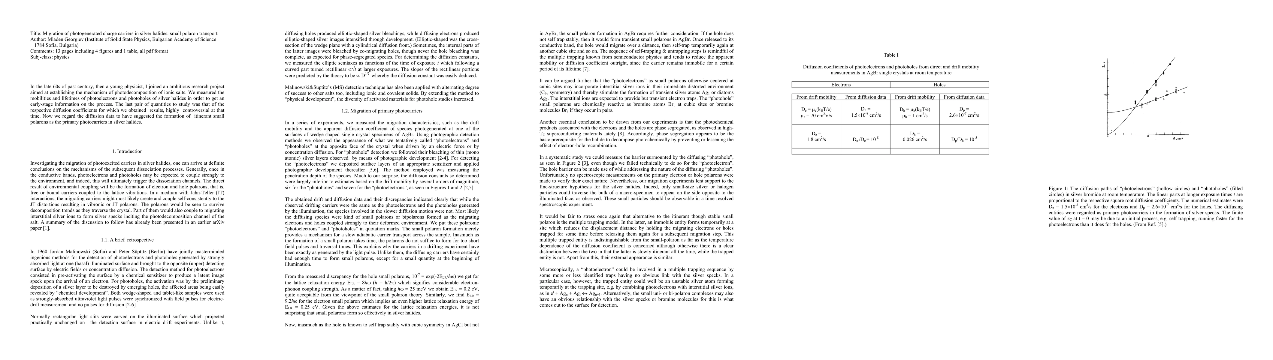 This paper revisits the photodecomposition mechanism of ionic salts, focusing on the diffusion of photogenerated charge carriers in silver bromide. The authors propose that the observed diffusion coefficients indicate the formation of itinerant Jahn-Teller small polarons as the subsequent photo-carriers in silver halides.