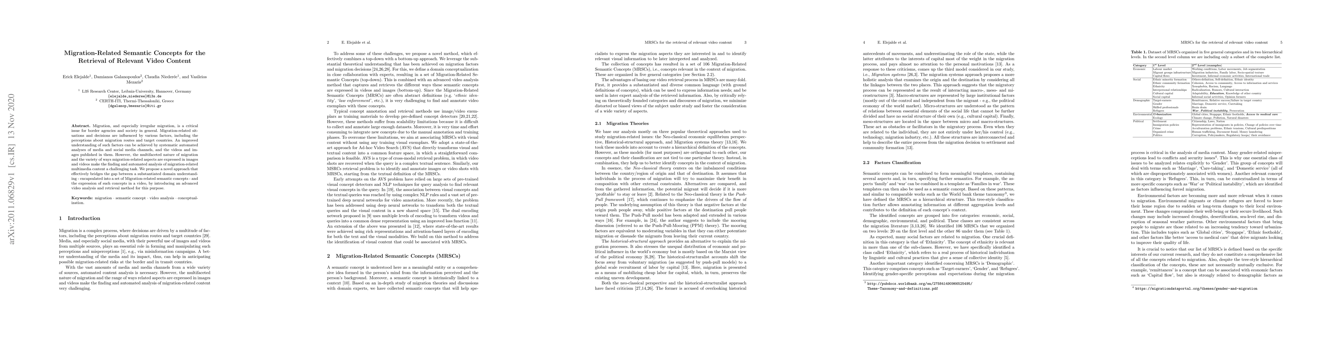 Migration, and especially irregular migration, is a critical issue for border agencies and society in general. Migration-related situations and decisions are influenced by various factors, including the perceptions about migration routes and target countries. An improved understanding of such factors can be achieved by systematic automated analyses of media and social media channels, and the videos and images published in them. However, the multifaceted nature of migration and the variety of ways migration-related aspects are expressed in images and videos make the finding and automated analysis of migration-related multimedia content a challenging task. We propose a novel approach that effectively bridges the gap between a substantiated domain understanding - encapsulated into a set of Migration-related semantic concepts - and the expression of such concepts in a video, by introducing an advanced video analysis and retrieval method for this purpose.