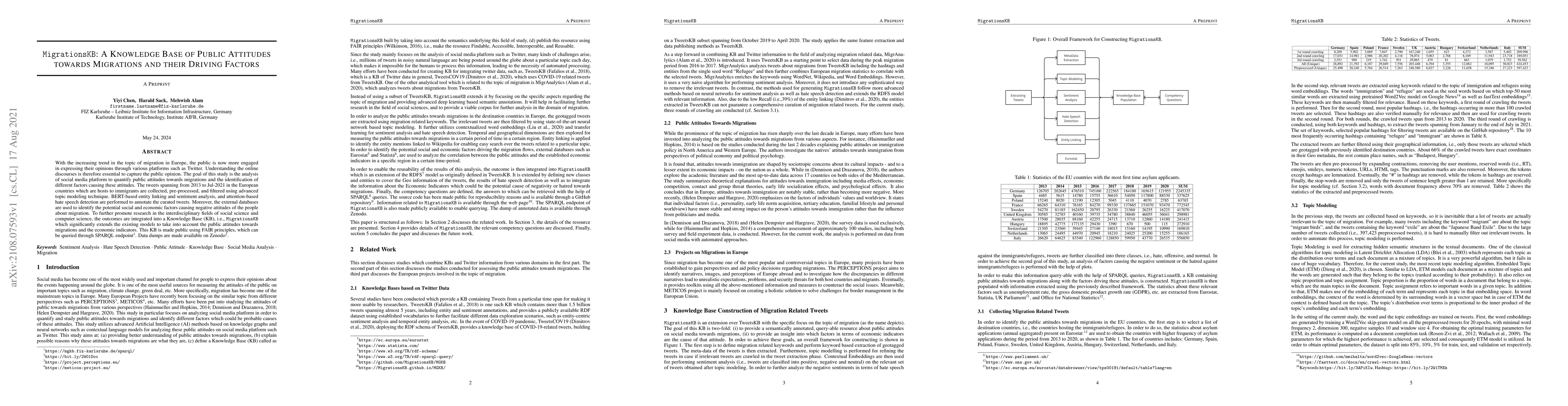 With the increasing trend in the topic of migration in Europe, the public is now more engaged in expressing their opinions through various platforms such as Twitter. Understanding the online discourses is therefore essential to capture the public opinion. The goal of this study is the analysis of social media platform to quantify public attitudes towards migrations and the identification of different factors causing these attitudes. The tweets spanning from 2013 to Jul-2021 in the European countries which are hosts to immigrants are collected, pre-processed, and filtered using advanced topic modeling technique. BERT-based entity linking and sentiment analysis, and attention-based hate speech detection are performed to annotate the curated tweets. Moreover, the external databases are used to identify the potential social and economic factors causing negative attitudes of the people about migration. To further promote research in the interdisciplinary fields of social science and computer science, the outcomes are integrated into a Knowledge Base (KB), i.e., MigrationsKB which significantly extends the existing models to take into account the public attitudes towards migrations and the economic indicators. This KB is made public using FAIR principles, which can be queried through SPARQL endpoint. Data dumps are made available on Zenodo.