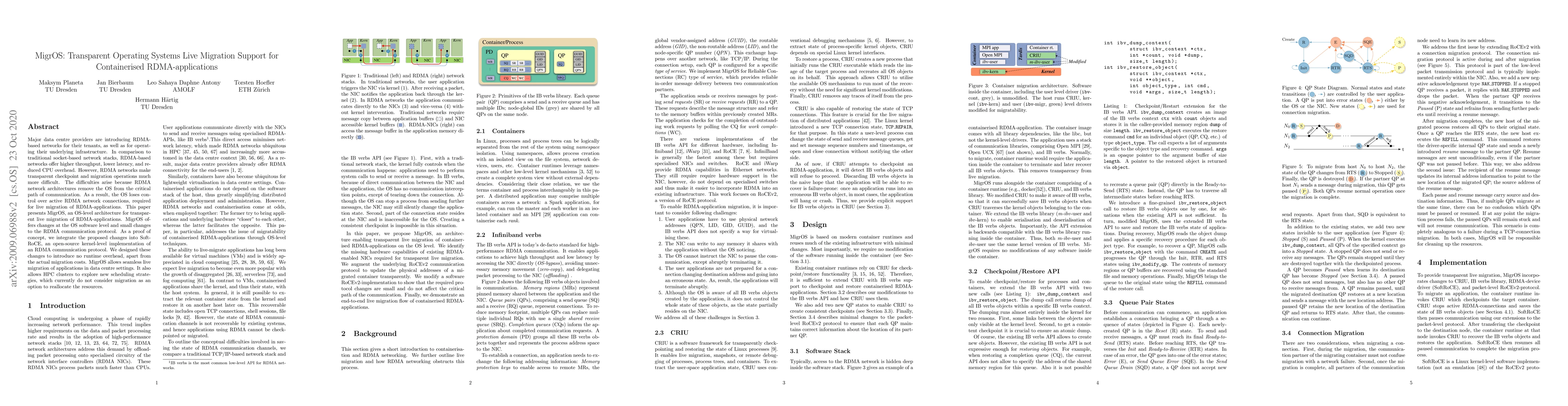 MigrOS proposes an OS-level architecture with protocol and software changes to enable transparent live migration of containerized RDMA applications, ensuring minimal performance impact.