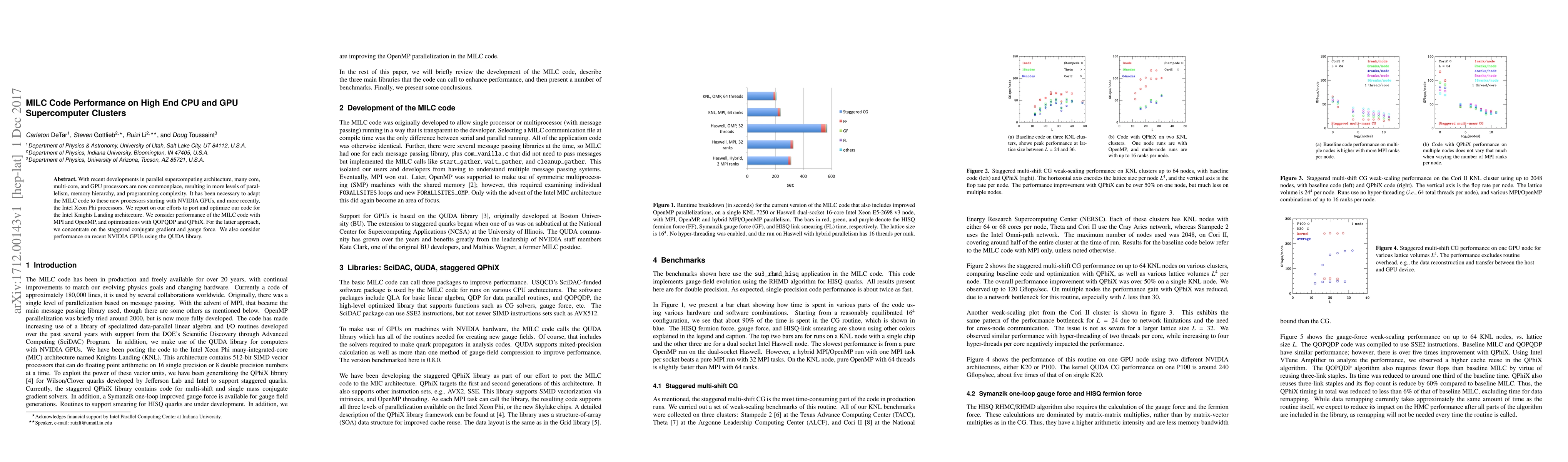 This paper reports on optimizing the MILC code for high-performance computing on both Intel Xeon Phi processors and recent NVIDIA GPUs, focusing on MPI and OpenMP parallelization, and specific optimizations like QOPQDP and QPhiX for the staggered conjugate gradient and gauge force. Performance comparisons on these architectures are also presented.