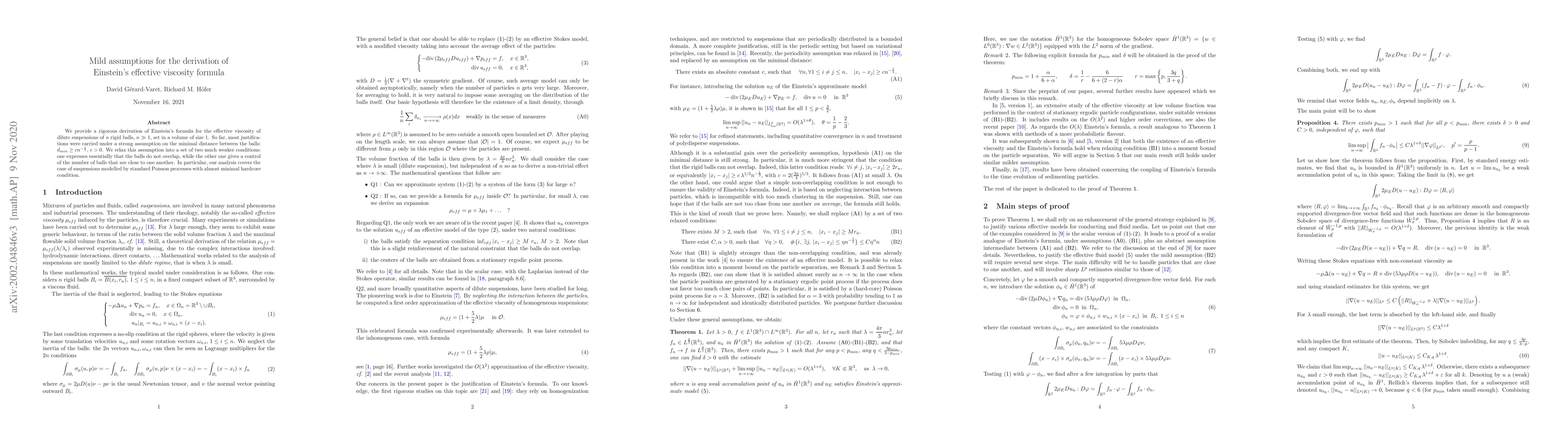 Researchers derived Einstein's effective viscosity formula for dilute suspensions without assuming a minimum distance between balls, instead using weaker conditions to prevent overlap and control close proximity.