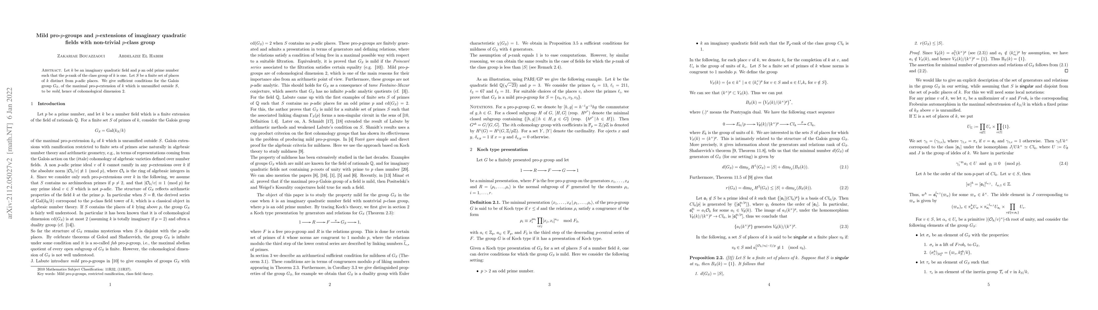 Let $k$ be an imaginary quadratic field and $p$ an odd prime number such that the $p$-rank of the class group of $k$ is one. Let $S$ be a finite set of places of $k$ distinct from $p$-adic places. We give sufficient conditions for the Galois group $G_S$, of the maximal pro-$p$-extension of $k$ which is unramified outside $S$, to be \textit{mild}, hence of cohomological dimension $2$.