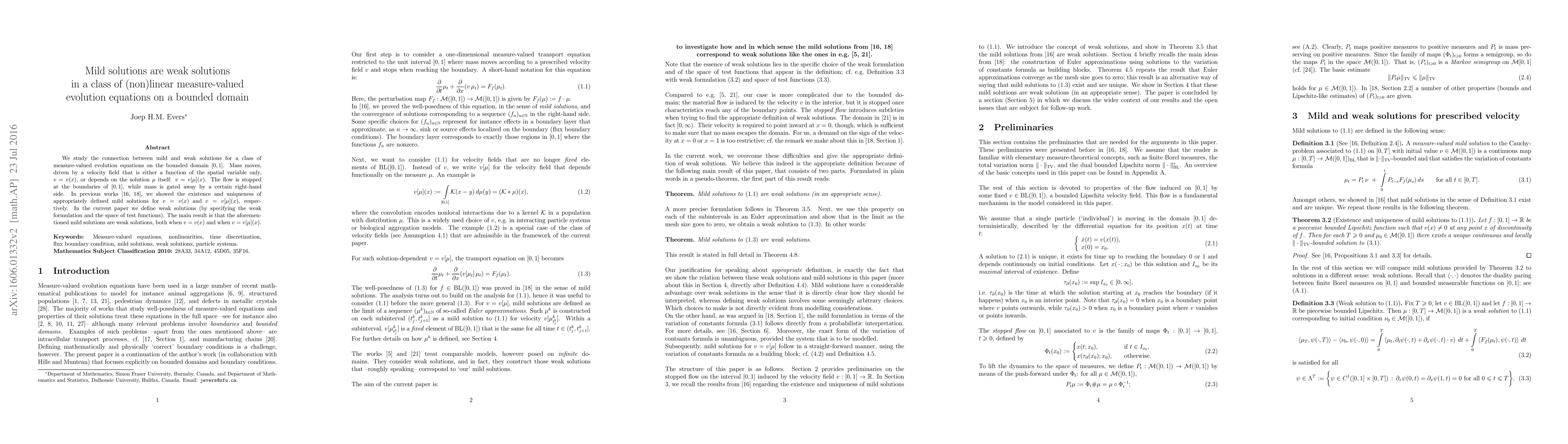 This paper investigates the relationship between mild and weak solutions for a class of measure-valued evolution equations, showing that mild solutions are indeed weak solutions in both cases where the velocity field depends either solely on the spatial variable or on the solution itself. The study confirms the equivalence for bounded domains with specific boundary conditions.