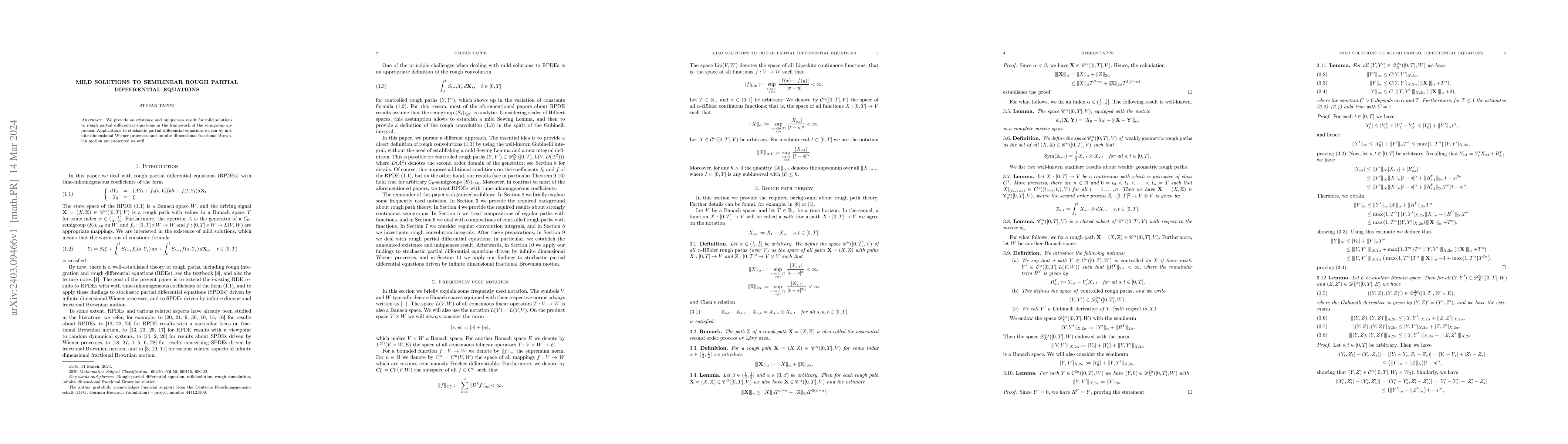 Summary: This paper establishes existence and uniqueness of mild solutions for rough partial differential equations using a semigroup approach, with applications to stochastic PDEs driven by infinite-dimensional Wiener processes and fractional Brownian motion.