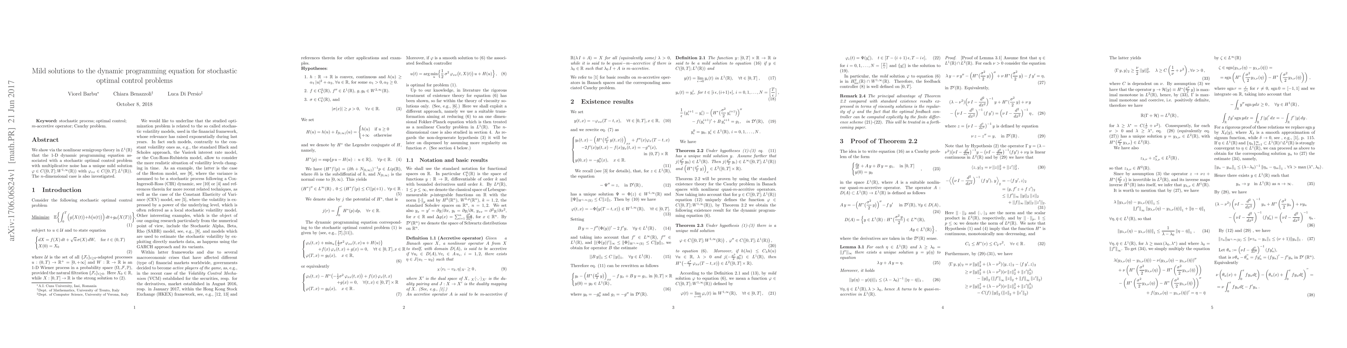 We show via the nonlinear semigroup theory in $L^1(\mathbb{R})$ that the $1$-D dynamic programming equation associated with a stochastic optimal control problem with multiplicative noise has a unique mild solution $\varphi\in C([0,T];W^{1,\infty}(\mathbb{R}))$ with $\varphi_{xx}\in C([0,T];L^1(\mathbb{R}))$. The $n$-dimensional case is also investigated.