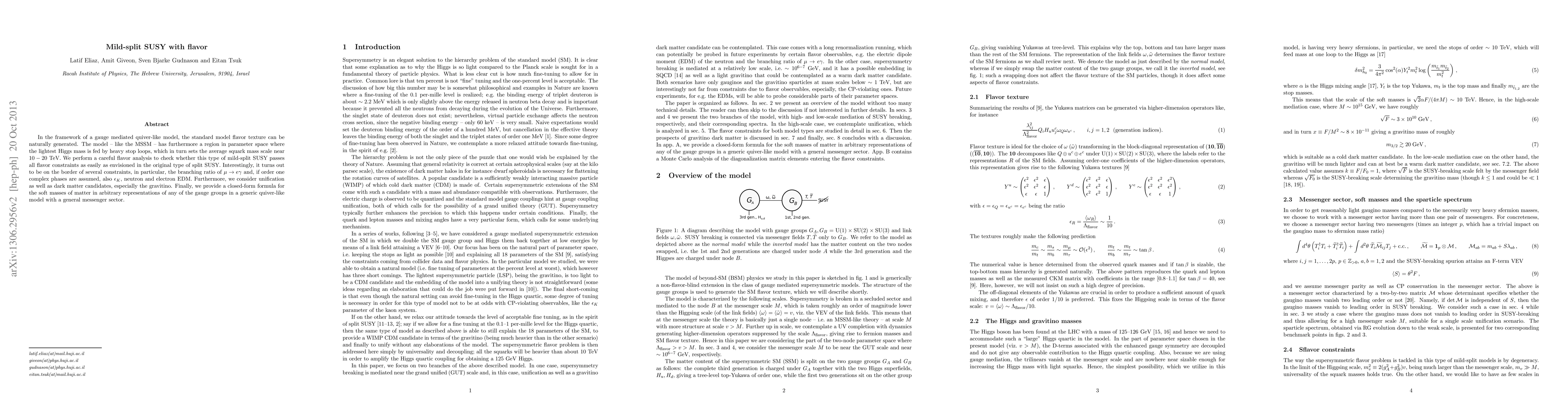 In the framework of a gauge mediated quiver-like model, the standard model flavor texture can be naturally generated. The model - like the MSSM - has furthermore a region in parameter space where the lightest Higgs mass is fed by heavy stop loops, which in turn sets the average squark mass scale near 10-20 TeV. We perform a careful flavor analysis to check whether this type of mild-split SUSY passes all flavor constraints as easily as envisioned in the original type of split SUSY. Interestingly, it turns out to be on the border of several constraints, in particular, the branching ratio of mu -> e gamma and, if order one complex phases are assumed, also epsilon_K neutron and electron EDM. Furthermore, we consider unification as well as dark matter candidates, especially the gravitino. Finally, we provide a closed-form formula for the soft masses of matter in arbitrary representations of any of the gauge groups in a generic quiver-like model with a general messenger sector.