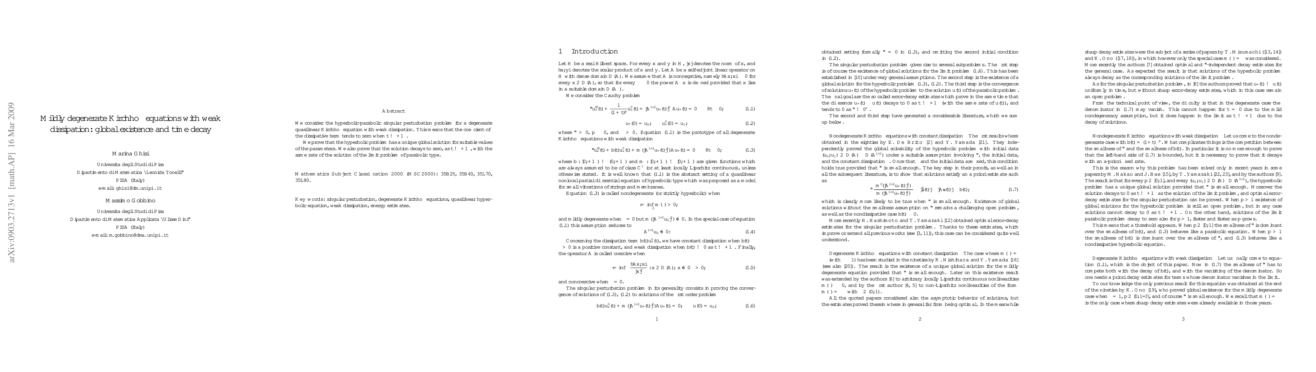 The paper proves global existence and time decay for a specific type of hyperbolic-parabolic problem involving a degenerate Kirchhoff equation with weak dissipation. As time approaches infinity, the solution's decay rate matches that of a related parabolic limit problem.