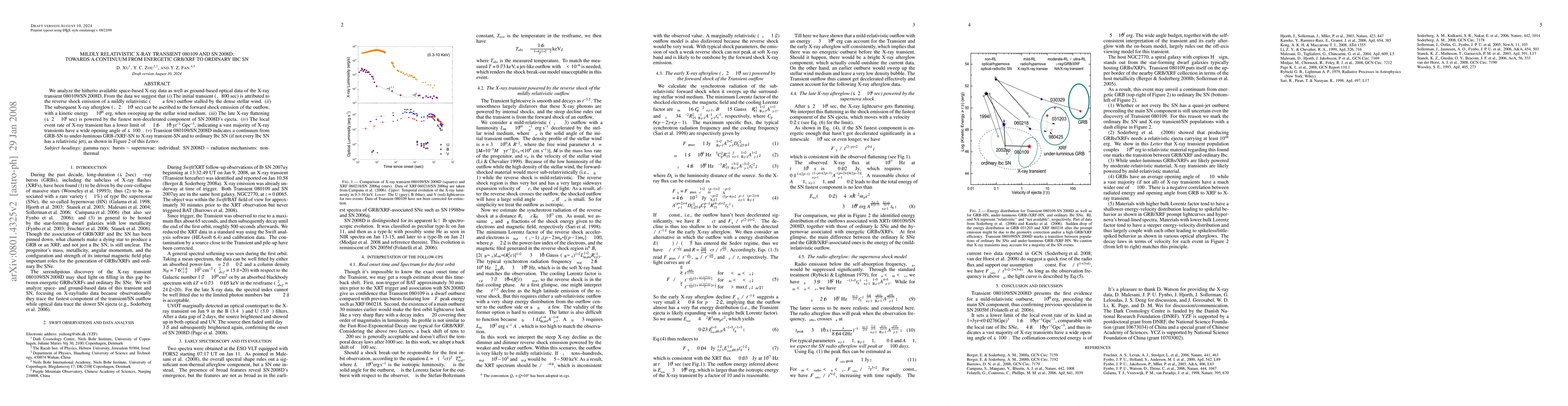 We analyze the hitherto available space-based X-ray data as well as ground-based optical data of the X-ray transient 080109/SN2008D. From the data we suggest that (i) The initial transient (\lesssim 800 sec) is attributed to the reverse shock emission of a mildly relativistic (\Gamma \sim a few) outflow stalled by the dense stellar wind. (ii) The subsequent X-ray afterglow (\lesssim 2\times 10^4 sec) can be ascribed to the forward shock emission of the outflow, with a kinetic energy \sim 10^{46} erg, when sweeping up the stellar wind medium. (iii) The late X-ray flattening (\gtrsim 2\times 10^4$ sec) is powered by the fastest non-decelerated component of SN2008D's ejecta. (iv) The local event rate of X-ray transient has a lower limit of \sim 1.6\times 10^4 yr^{-1} Gpc^{-3}, indicating a vast majority of X-ray transients have a wide opening angle of \gtrsim 100 degree. The off-axis viewing model is less likely. (v) Transient 080109/SN2008D may lead to a continuum from GRB-SN to under-luminous GRB-/XRF-SN to X-ray transient-SN and to ordinary Ibc SN (if not every Ibc SN has a relativistic jet), as shown in Figure 2 of this Letter.