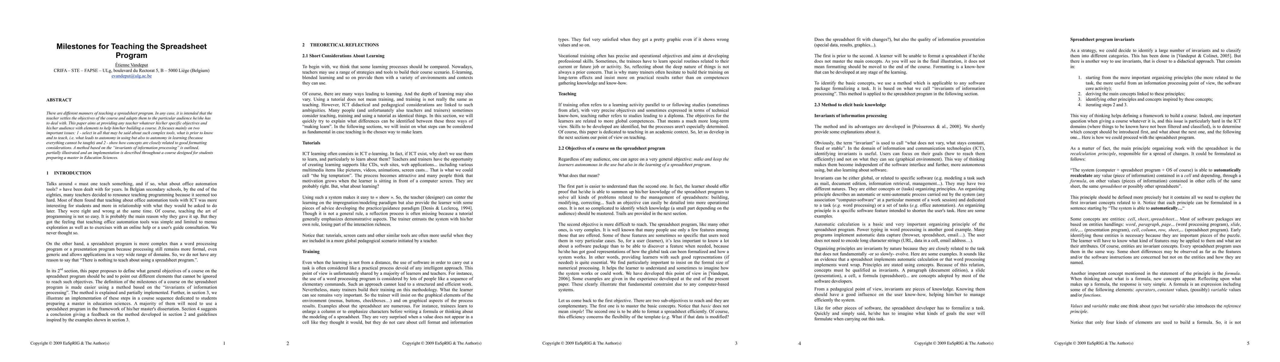 There are different manners of teaching a spreadsheet program. In any case, it is intended that the teacher settles the objectives of the course and adapts them to the particular audience he/she has to deal with. This paper aims at providing any teacher whatever his/her specific objectives and his/her audience with elements to help him/her building a course. It focuses mainly on two important issues: 1 - select in all that may be said about such complex tools, what is prior to know and to teach, i.e. what leads to autonomy in using but also to autonomy in learning (because everything cannot be taught) and 2 - show how concepts are closely related to good formatting considerations. A method based on the "invariants of information processing" is outlined, partially illustrated and an implementation is described throughout a course designed for students preparing a master in Education Sciences.