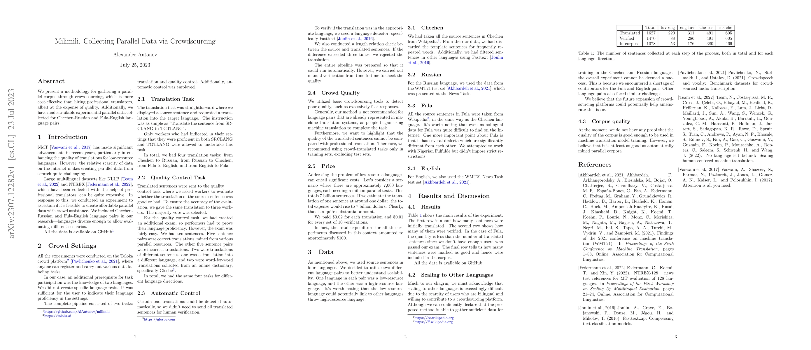 Summary: This paper introduces a cost-effective crowdsourcing method for collecting parallel corpora, demonstrating its application in creating Chechen-Russian and Fula-English datasets, albeit with potential trade-offs in translation quality compared to professional services.