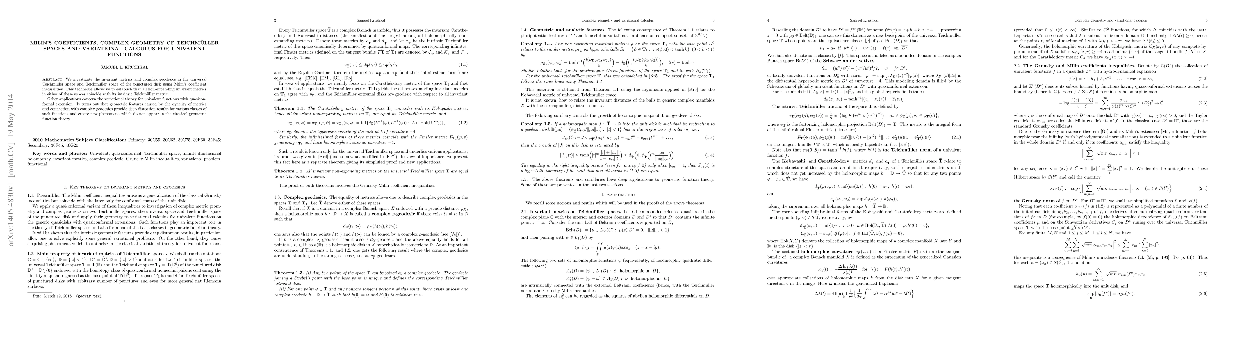 This paper explores invariant metrics and complex geodesics in Teichmüller spaces using Milin's coefficient inequalities, proving that all non-expanding invariant metrics coincide with the intrinsic Teichmüller metric. It also applies these results to the variational theory of univalent functions, revealing new geometric phenomena and distortion results.