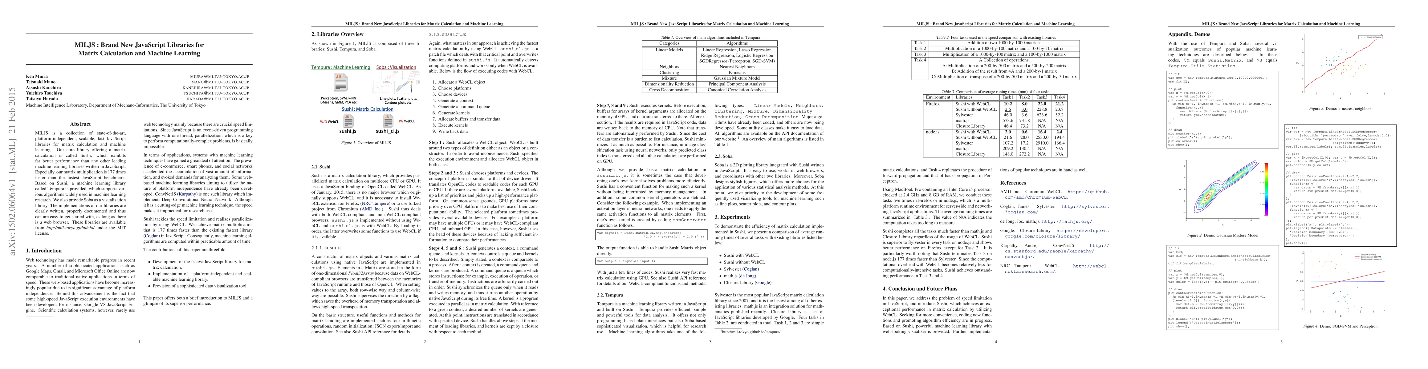 The research introduces MILJS, a collection of JavaScript libraries for matrix calculation and machine learning, including Sushi for matrix calculations, Tempura for machine learning algorithms, and Soba for visualization. The libraries utilize WebCL for parallel matrix calculations on multicore CPUs or GPUs.
