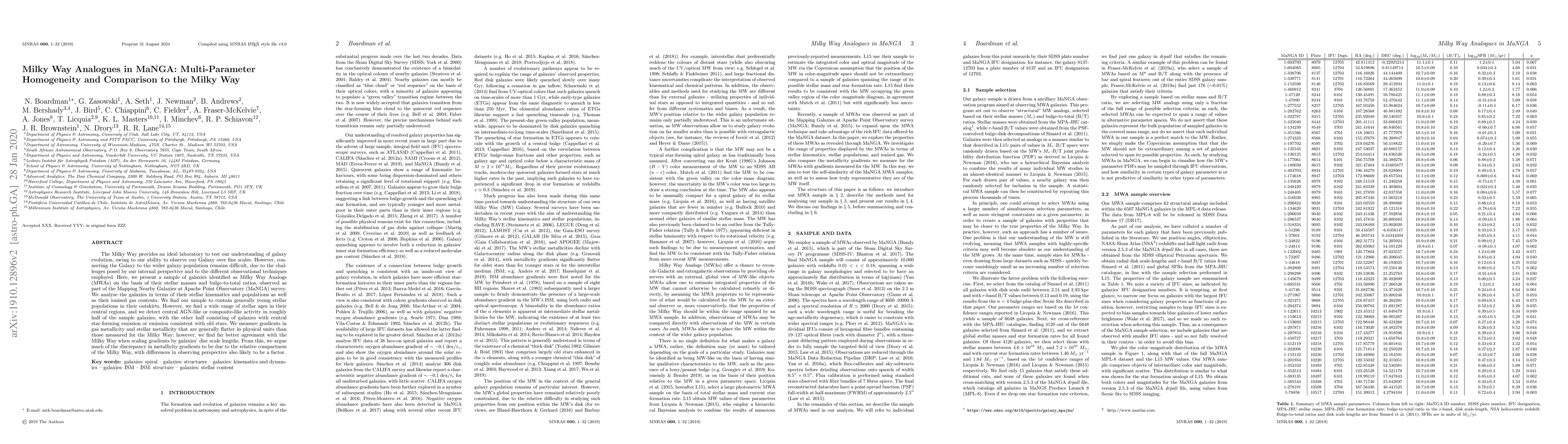 The Milky Way provides an ideal laboratory to test our understanding of galaxy evolution, owing to our ability to observe our Galaxy over fine scales. However, connecting the Galaxy to the wider galaxy population remains difficult, due to the challenges posed by our internal perspective and to the different observational techniques employed. Here, we present a sample of galaxies identified as Milky Way Analogs (MWAs) on the basis of their stellar masses and bulge-to-total ratios, observed as part of the Mapping Nearby Galaxies at Apache Point Observatory (MaNGA) survey. We analyse the galaxies in terms of their stellar kinematics and populations as well as their ionised gas contents. We find our sample to contain generally young stellar populations in their outskirts. However, we find a wide range of stellar ages in their central regions, and we detect central AGN-like or composite-like activity in roughly half of the sample galaxies, with the other half consisting of galaxies with central star-forming emission or emission consistent with old stars. We measure gradients in gas metallicity and stellar metallicity that are generally flatter in physical units than those measured for the Milky Way; however, we find far better agreement with the Milky Way when scaling gradients by galaxies' disc scale lengths. From this, we argue much of the discrepancy in metallicity gradients to be due to the relative compactness of the Milky Way, with differences in observing perspective also likely to be a factor.
