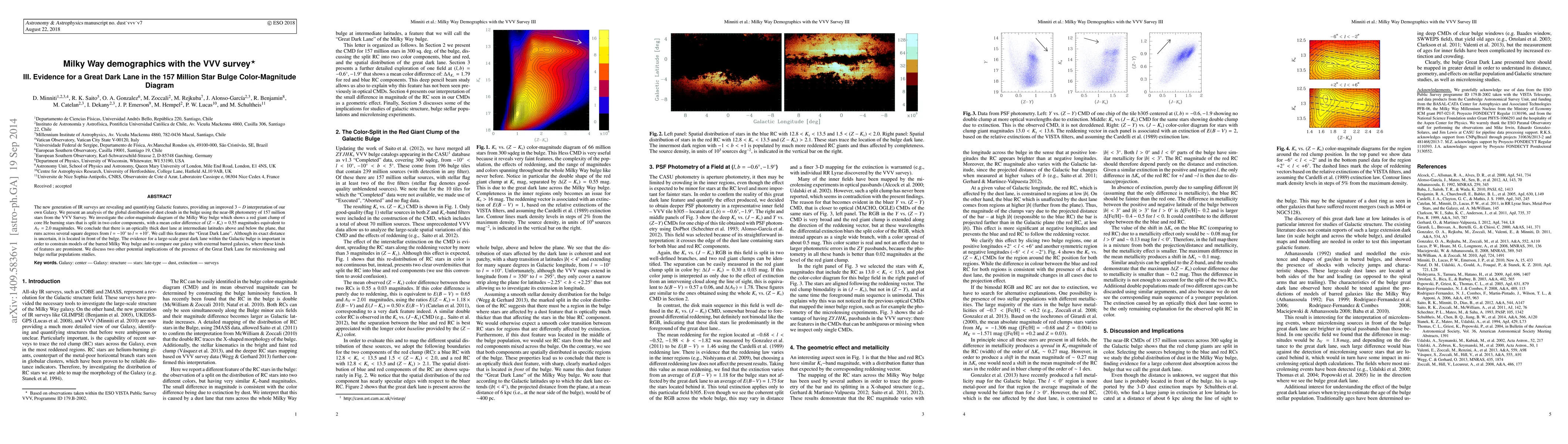 The VVV Survey reveals a "Great Dark Lane" in the Milky Way's bulge, an optically thick dust feature splitting the red giant clump in the color-magnitude diagram, which has implications for Galactic models and comparisons with barred galaxies. This lane, located in front of the bulge, may also affect microlensing and bulge stellar population studies.