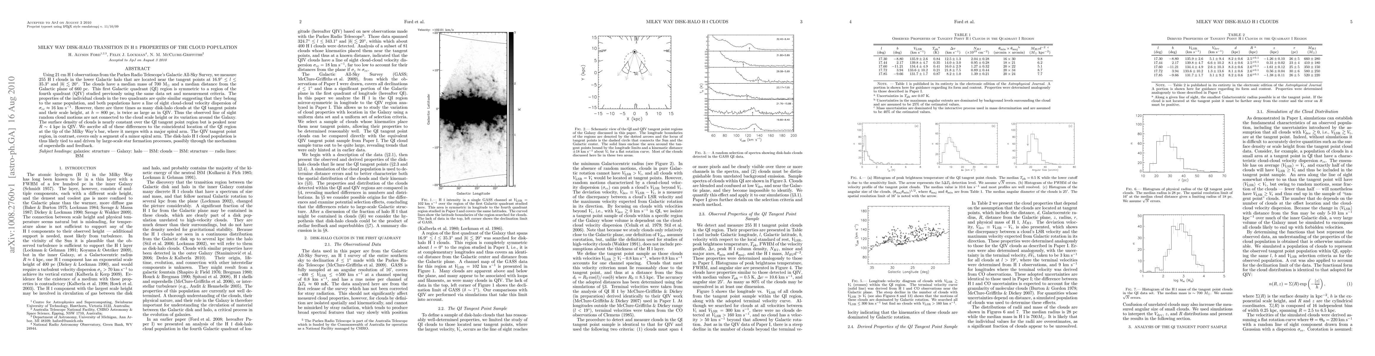 Using 21cm HI observations from the Parkes Radio Telescope's Galactic All-Sky Survey, we measure 255 HI clouds in the lower Galactic halo that are located near the tangent points at 16.9 < l < 35.3 degrees and |b| < 20 degrees. The clouds have a median mass of 700 Msun and a median distance from the Galactic plane of 660 pc. This first Galactic quadrant (QI) region is symmetric to a region of the fourth quadrant (QIV) studied previously using the same data set and measurement criteria. The properties of the individual clouds in the two quadrants are quite similar suggesting that they belong to the same population, and both populations have a line of sight cloud-cloud velocity dispersion of sigma_cc ~ 16 km/s. However, there are three times as many disk-halo clouds at the QI tangent points and their scale height, at h=800 pc, is twice as large as in QIV. Thus the observed line of sight random cloud motions are not connected to the cloud scale height or its variation around the Galaxy. The surface density of clouds is nearly constant over the QI tangent point region but is peaked near R~4 kpc in QIV. We ascribe all of these differences to the coincidental location of the QI region at the tip of the Milky Way's bar, where it merges with a major spiral arm. The QIV tangent point region, in contrast, covers only a segment of a minor spiral arm. The disk-halo HI cloud population is thus likely tied to and driven by large-scale star formation processes, possibly through the mechanism of supershells and feedback.