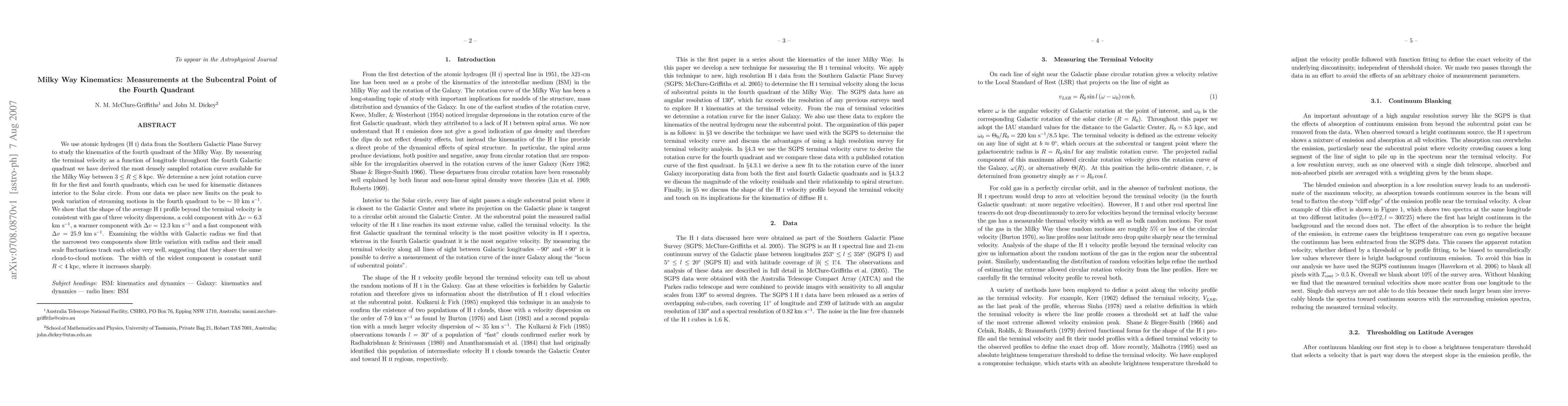 We use atomic hydrogen (HI) data from the Southern Galactic Plane Survey to study the kinematics of the fourth quadrant of the Milky Way. By measuring the terminal velocity as a function of longitude throughout the fourth Galactic quadrant we have derived the most densely sampled rotation curve available for the Milky Way between 3 < R < 8 kpc. We determine a new joint rotation curve fit for the first and fourth quadrants, which can be used for kinematic distances interior to the Solar circle. From our data we place new limits on the peak to peak variation of streaming motions in the fourth quadrant to be ~10 km/s. We show that the shape of the average HI profile beyond the terminal velocity is consistent with gas of three velocity dispersions, a cold component with $\Delta v=6.3$ km/s, a warmer component with $\Delta v=12.3$ km/s and a fast component with $\Delta v=25.9$ km/s. Examining the widths with Galactic radius we find that the narrowest two components show little variation with radius and their small scale fluctuations track each other very well, suggesting that they share the same cloud-to-cloud motions. The width of the widest component is constant until R<4 kpc, where it increases sharply.