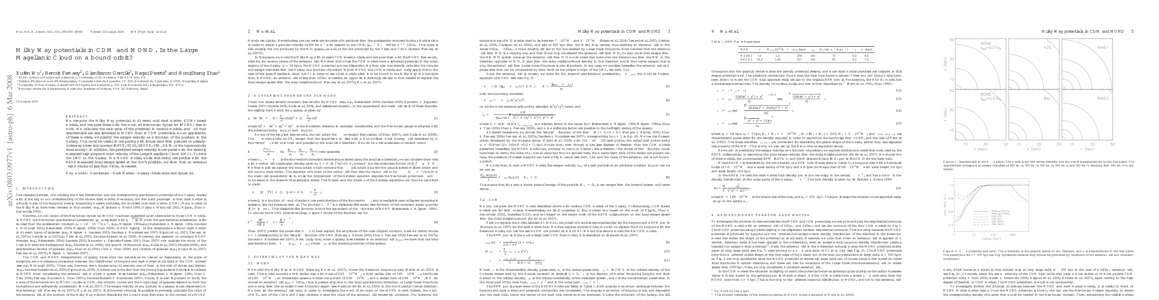 Researchers compared Milky Way potentials in CDM and MOND frameworks, finding that isopotentials are less spherical in MOND, and found an external field modulus of less than $0.03 a_0$ needed to bind the Large Magellanic Cloud to the Galaxy.