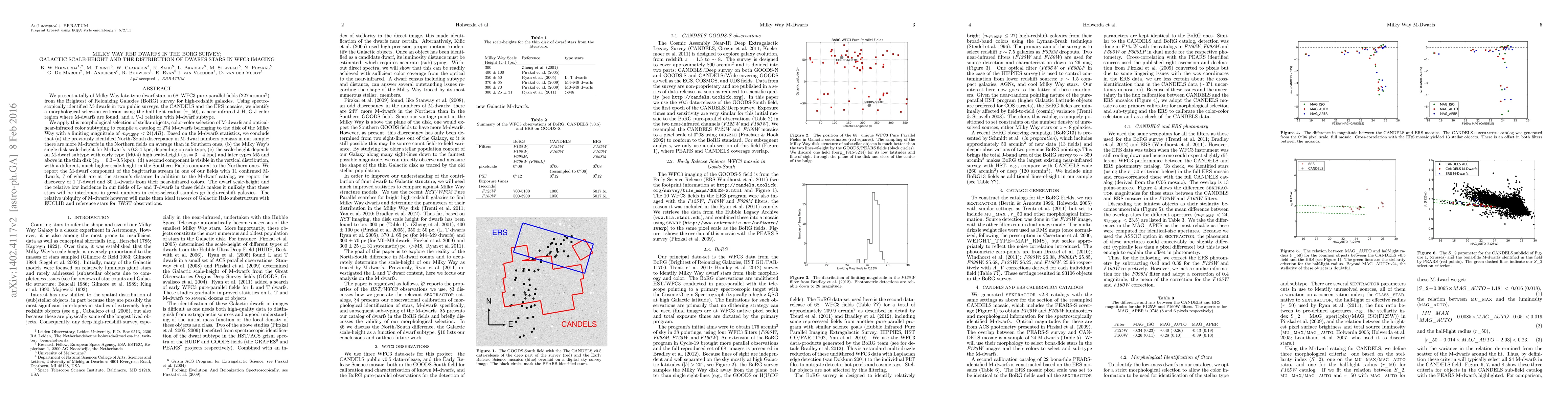This study catalogs 274 M-dwarf stars in the Milky Way's disk using the BoRG survey, identifying a North/South discrepancy in their distribution. The analysis reveals a single disk scale-height of 0.3-4 kpc for M-dwarfs, with a constant $z_0$=600 pc, and a second component with a higher scale-height, suggesting M-dwarfs as ideal tracers for Galactic Halo substructure.