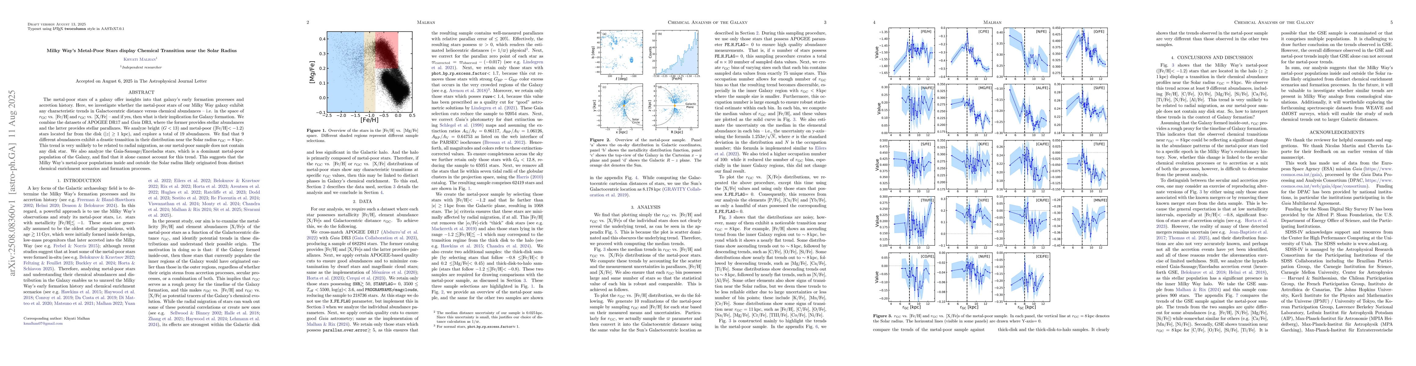 The metal-poor stars of a galaxy offer insights into that galaxy's early formation processes and accretion history. Here, we investigate whether the metal-poor stars of our Milky Way galaxy exhibit any characteristic trends in Galactocentric distance versus chemical abundances -- i.e. in the space of $r_{\rm GC}$ vs. [Fe/H] and $r_{\rm GC}$ vs. [X/Fe] -- and if yes, then what is their implication for Galaxy formation. We combine the datasets of APOGEE DR17 and $\textit{Gaia}$ DR3, where the former provides stellar abundances and the latter provides stellar parallaxes. We analyze bright ($G<13$) and metal-poor ([Fe/H]$<-1.2$) stars located far from the disk ($|z|\geq1$ kpc), and explore a total of $19$ abundances. We find that $9$ different abundances exhibit a drastic transition in their distribution near the Solar radius $r_{\rm GC}=8$ kpc. This trend is very unlikely to be related to radial migration, as our metal-poor sample does not contain any disk star. We also analyze the Gaia-Sausage/Enceladus stars, which is a dominant metal-poor population of the Galaxy, and find that it alone cannot account for this trend. This suggests that the Milky Way's metal-poor populations inside and outside the Solar radius likely originated from distinct chemical enrichment scenarios and formation processes.